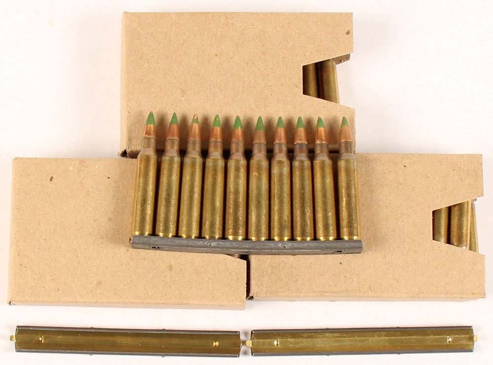 Lot of three, sleeves of Lack city, 5.56x45mm Nato M855 Green tip 80's dated, 60 total Rds. On clips, comes with two extra clips, brown sleeves with no markings, ammo ranges from excellent to very good. Grade: Excellent - Value: 20 to 50