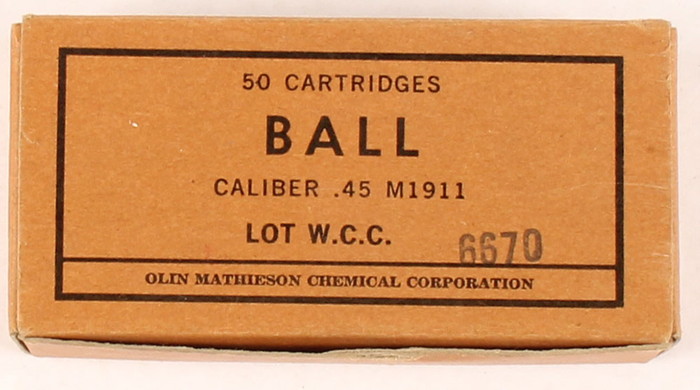 Olin, .45 M1911 Ball (.45 ACP), Partial 45 Rds., steel case & mixed H/S, 1pc, brown box with black print, box is solid with light wear, ammo ranges from very good to good. Grade: Very Good ++ - Value: 8 to 20