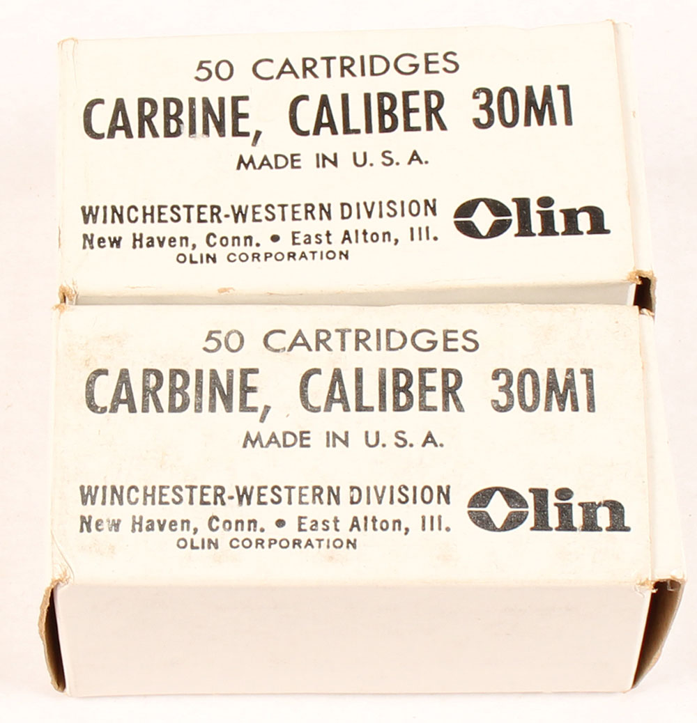 Lot of two, Olin, .30 Carbine M1, both Full, ''WCC 72'' H/S, 1pc, white box with black print, boxes have some rub wear & age soiling, ammo is excellent. Grade: Excellent + - Value: 40 to 80