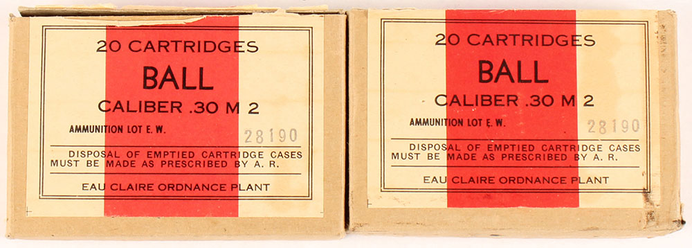 Lot of two, EAU Claire ordnance Plant, .30 M2 Ball (.30-06), both lot E.W. 28190, Both are full one is SEALED, open box H/S ''EW 43'', 1PC, buff boxes with buff/red labels & black print, boxes are solid with minor age soiling, handling wear, & rub wear. Ammo in open box is excellent, 1943 dated ammo, primers are corrosive. Grade: very good ++ - Value: 30 to 60
