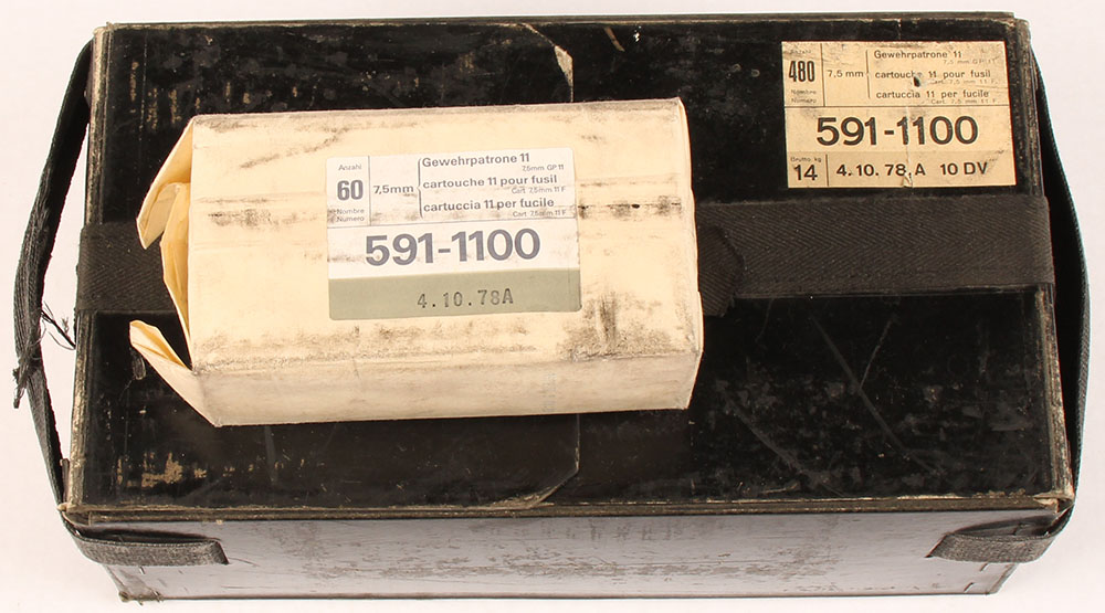 Swiss Altdorf,7.5x55mm Swiss GP11, dated 1978, 480 Rd. case that holds eight 60 Rd. bricks, that then contain six 10 Rd. boxes, Partial 420 Rds. total, One 60 Rd. bricks is gone, one inside brick is opened the rest are SEALED, case is hard carboard painted black, bricks are white paper, inside boxes are white cardboard, all have a white/green label & black print. Boxes inside the open brick are SEALED. The case has rub wear on sides & corners, bricks have light rust wear as well. Grade: Excellent + - Value: 210 to 420