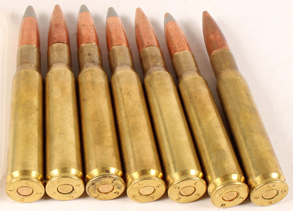 Lot of 7, .50 BMG, Lake city mix dated from early 2000's, one non Lake City H/S, 4 Rds. Of silver tip, 3 Rds. Of FMJ, Grade: Excellent - Value: 40 to 80