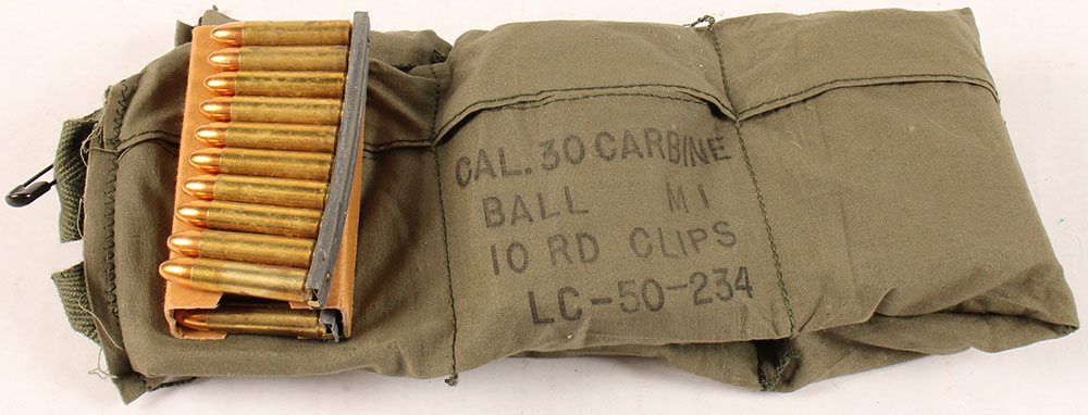 US, lake City, .30 Carbine, 6 pouch Bandoleer, each pouch has two 10 Rd clips, 120 Rds. total, Bandoleer is marked ''CAL .30 CARBINE'', ''BALL M1'', ''10 RD CLIPS'', ''LC-50-234'', back of bandoleer is marked ''KP.M.4/71, .30 carbine ammo is dated 1972, ammo ranges from very good to good. Grade: Excellent - Value: 60 to 120