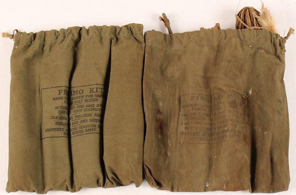 Lot of two, WW2, Ashaway, US Emergency Rafe escape & survival fishing kits, has netting, line sets, hooks, weights, knives, instruction manual & other fishing accessories, one case in complete the other just has two line sets with hooks. The cases have some stains & rub wear but have no tears or split seams. Grade: Very Good ++ - Value: 40 to 160