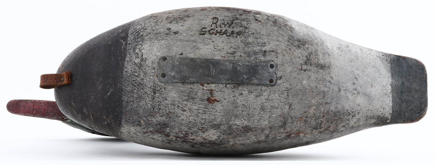 Hooded Merganser Drake by R.W. Schaap, GE, solid cedar wood, original paint, structurally excellent, signed on bottom, 16'' OAL. Grade: Excellent - Value: 150 to 400