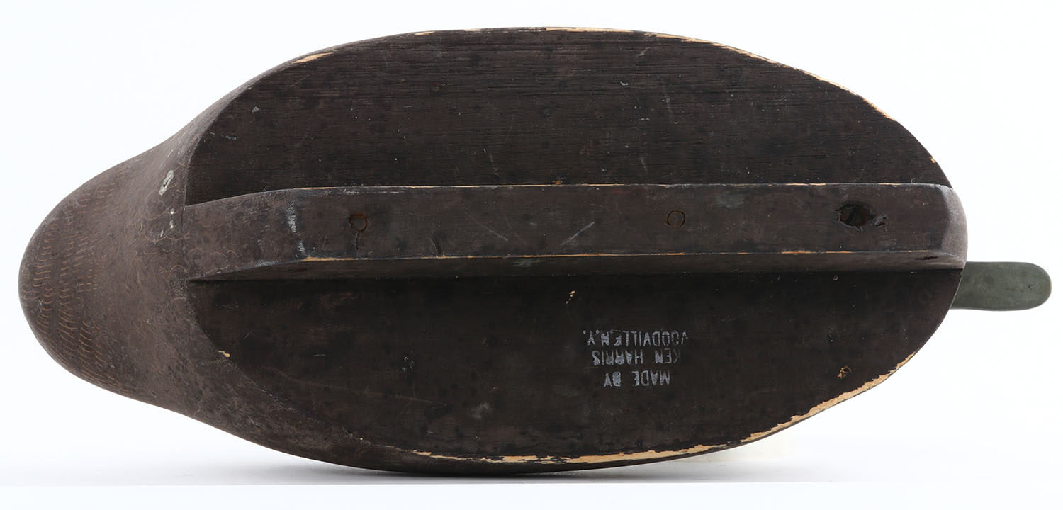 Black Duck by Ken Harris, Woodville, NY, glass eyes, structurally excellent, hollow wood, well marked on bottom, original paint is very nice, 18 1/4'' OAL. Grade: Excellent + - Value: 100 to 250