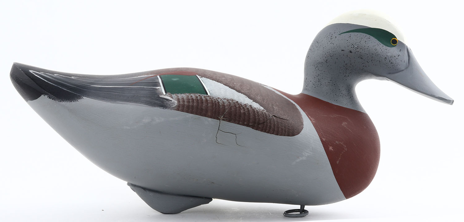 Widgeon Drake by John H. Clark, Havre De Grace, MD, painted eyes, solid wood, original paint, structurally excellent, signed on bottom, 14 1/2'' OAL. Grade: Excellent ++ - Value: 40 to 80