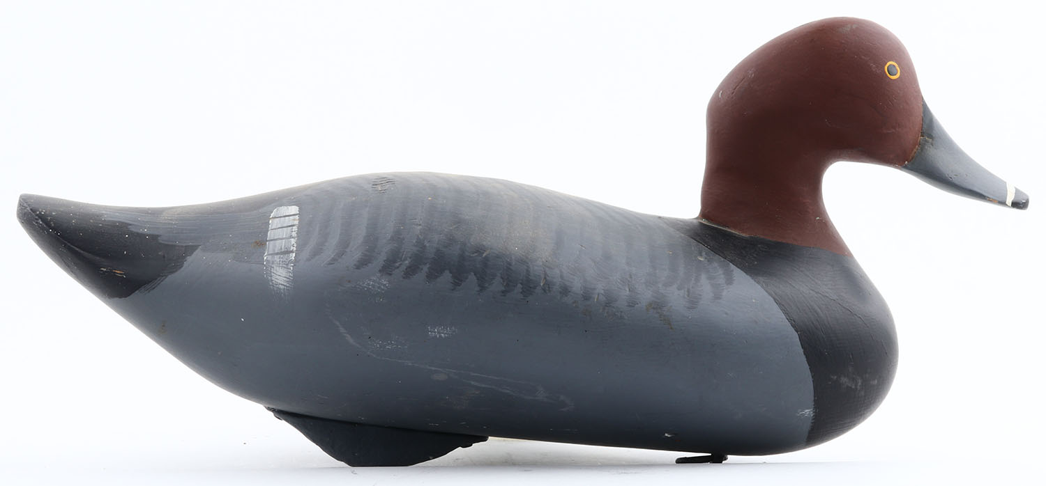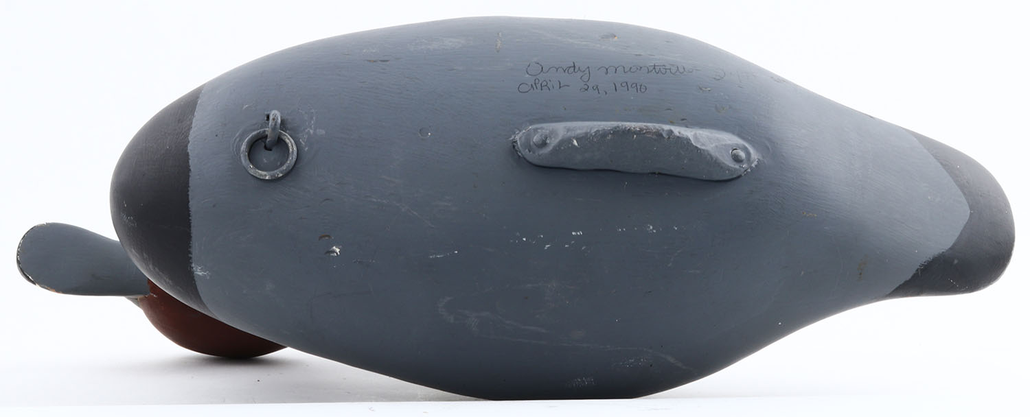 Redhead Drake Andy Mont???, MD carver, painted eyes, solid wood, original paint, structurally excellent, signed on bottom, 16'' OAL. Grade: Excellent - Value: 40 to 80