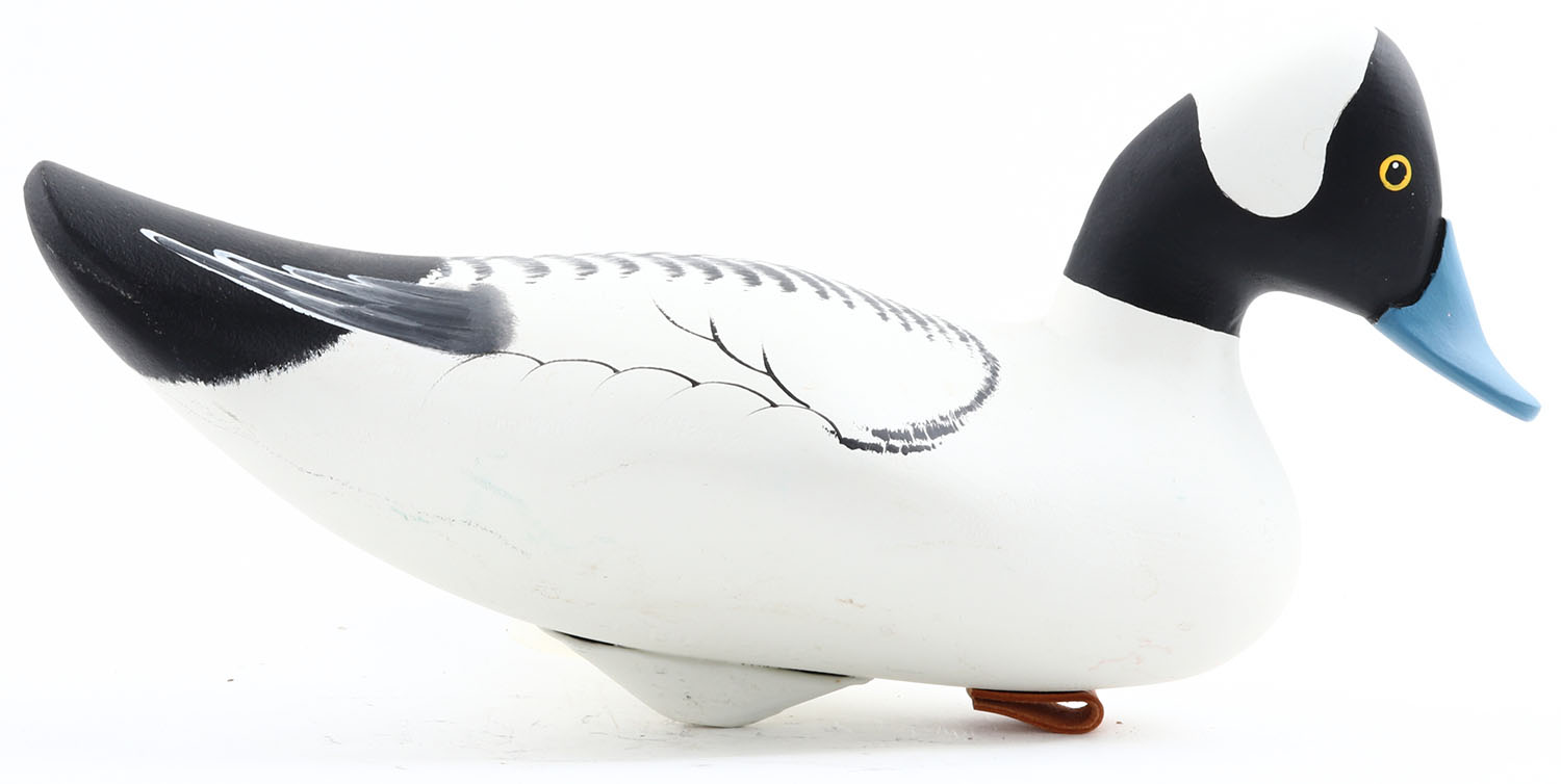 Bufflehead Drake by Jeff Spencer from MD, PE, solid wood, original paint, branded on bottom, structurally excellent, 14'' OAL. Grade: Excellent ++ - Value: 40 to 80