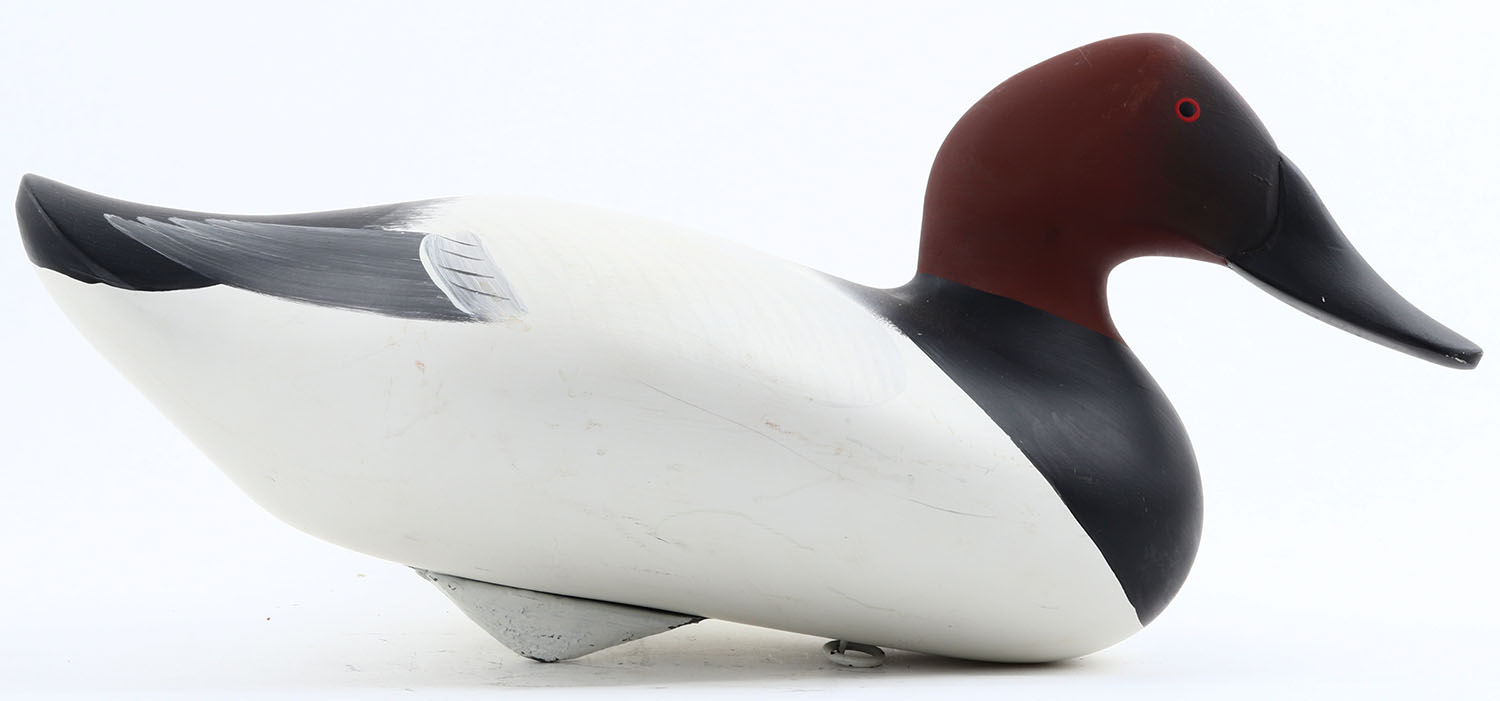Canvasback Drake by Patrick ''Pat'' Vincent, Churchville, MD, painted eyes, solid wood, original paint, structurally excellent, signed on bottom, 16'' OAL. Grade: Excellent ++ - Value: 50 to 100