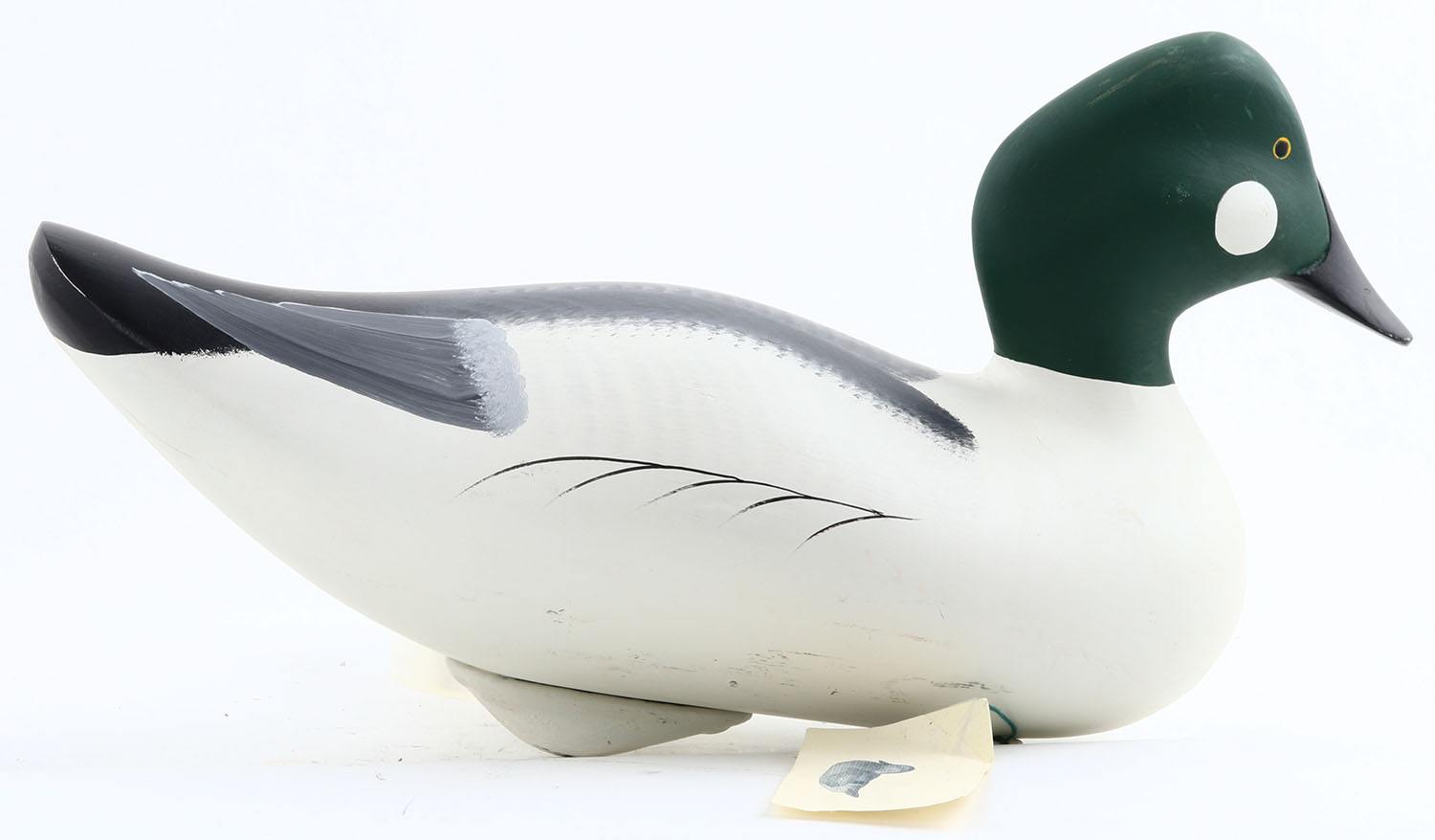 Goldeneye Drake by John H. Clark, Havre De Grace, MD, painted eyes, solid wood, original paint, structurally excellent, signed on bottom, 14'' OAL. Grade: Excellent + - Value: 40 to 80