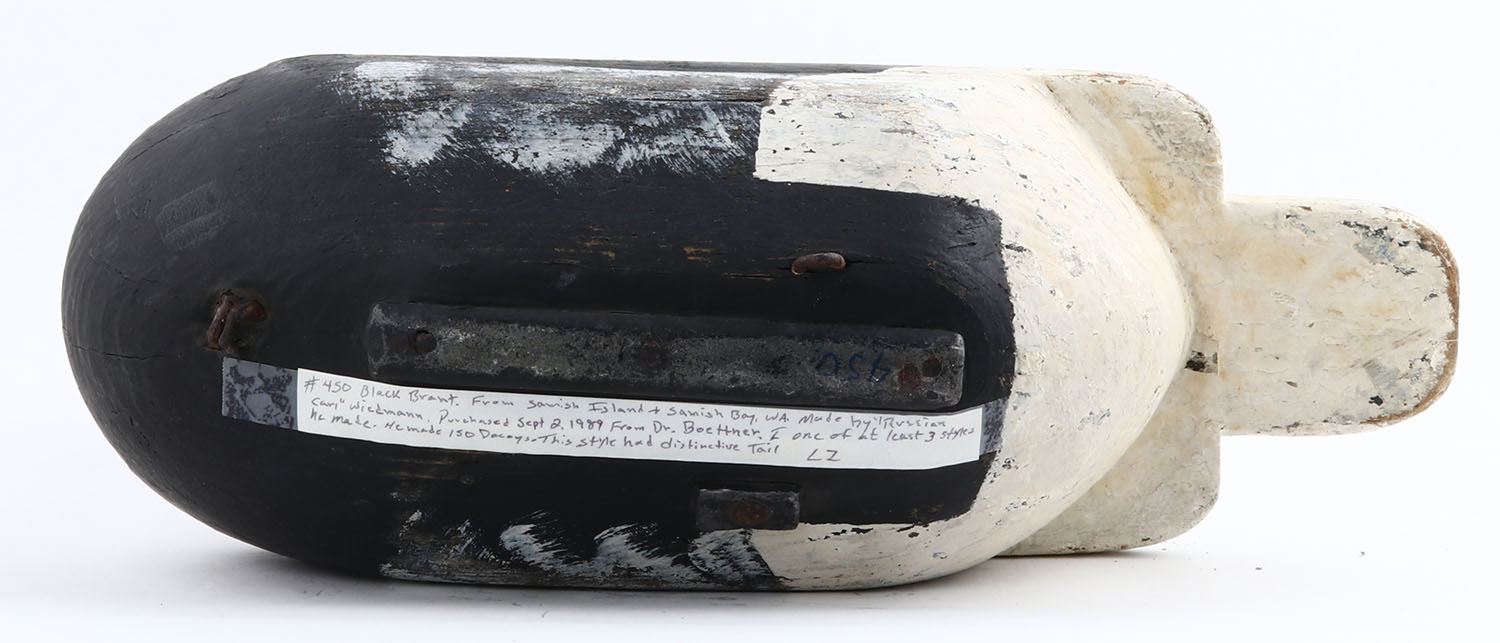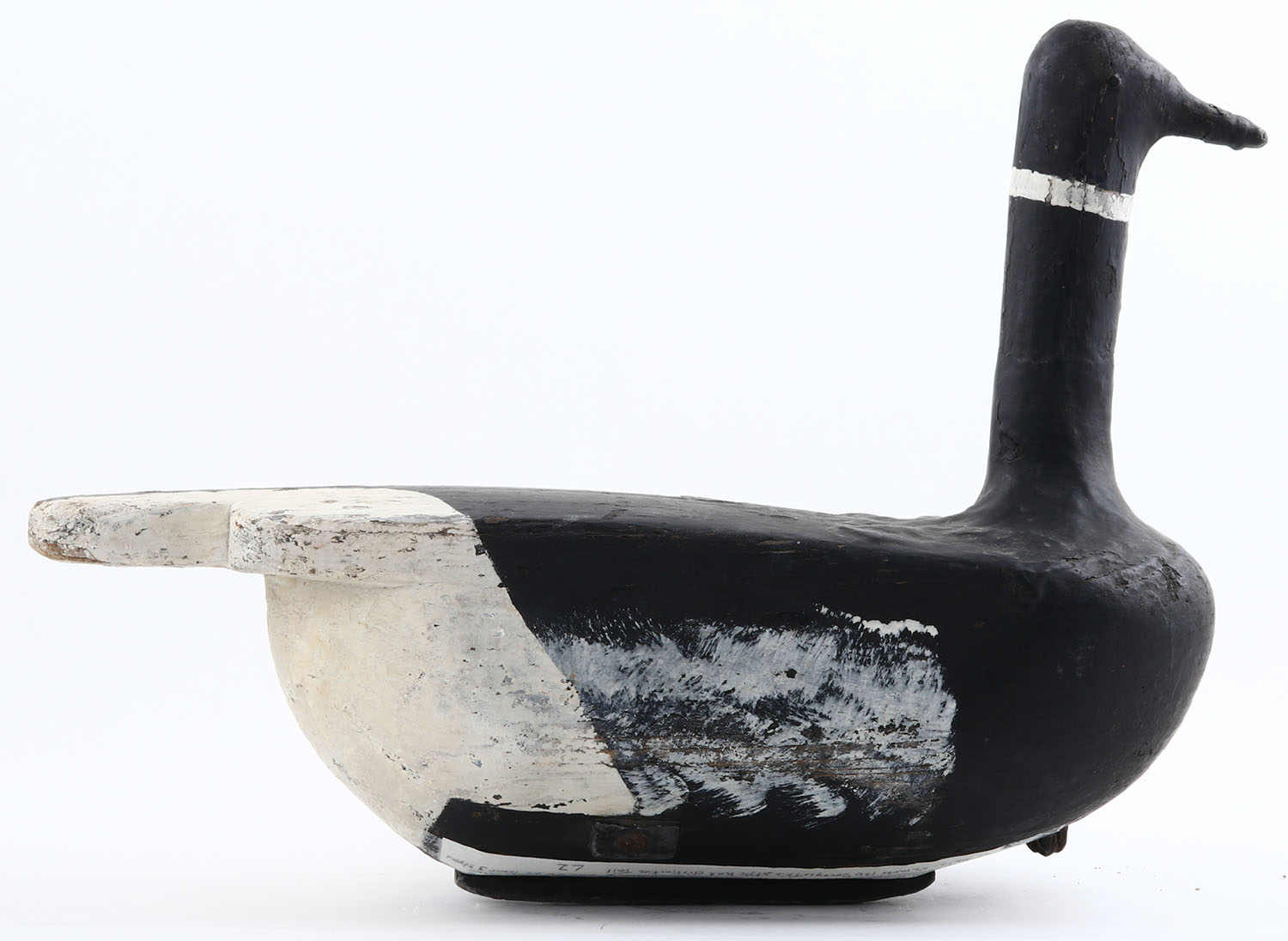 Black Brant by Russian Carl Willmann, no eyes, solid wood original paint with some working repaint to neck & head, he made three styles & 150 decoys in total, 18'' OAL. Grade: Very Good - Value: 50 to 250