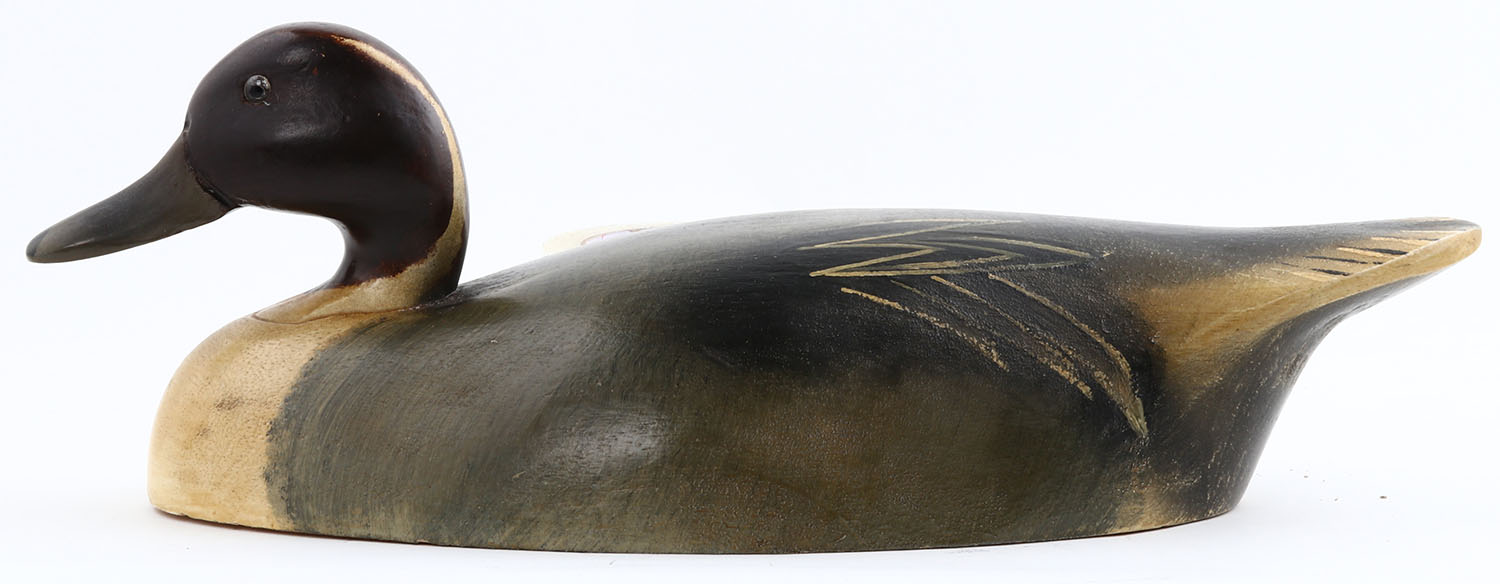 Pintail Drake by Wildfowler Decoy Co. Old Saybrook Conn., GE, pine wood, original paint, no stamp on bottom, circa 1939, 16'' OAL. Grade: Excellent - Value: 200 to 400
