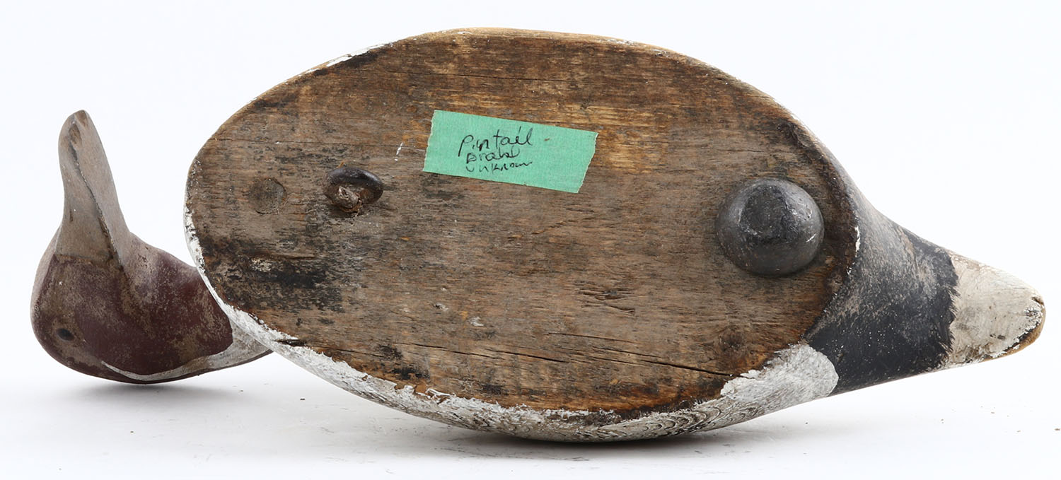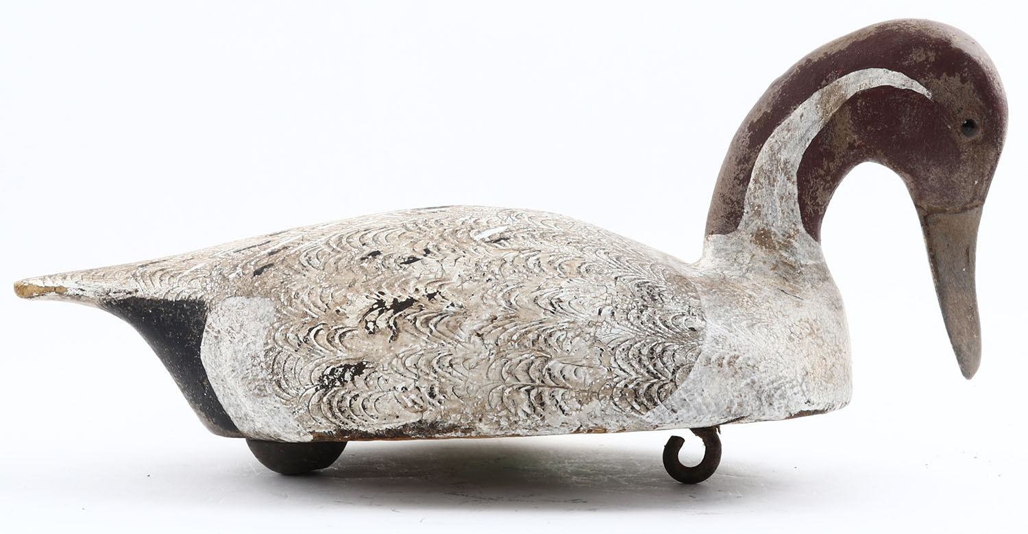 Preening Pintal Drake by unknown maker, GE, solid wood, original paint is worn, structurally excellent, 13 1/2'' OAL. Grade: Excellent - Value: 30 to 90