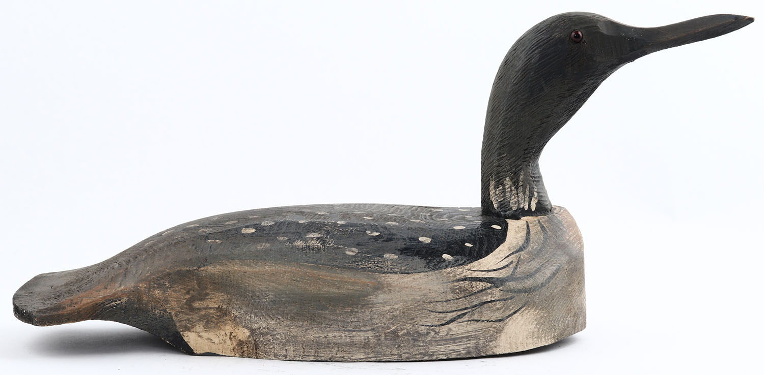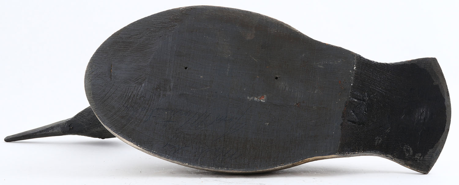 Loon by Tom Martindale, Ontario, Canada, glass eyes, hollow wood, original paint, structurally excellent, signed on bottom, 17'' OAL. Grade: Excellent - Value: 50 to 100
