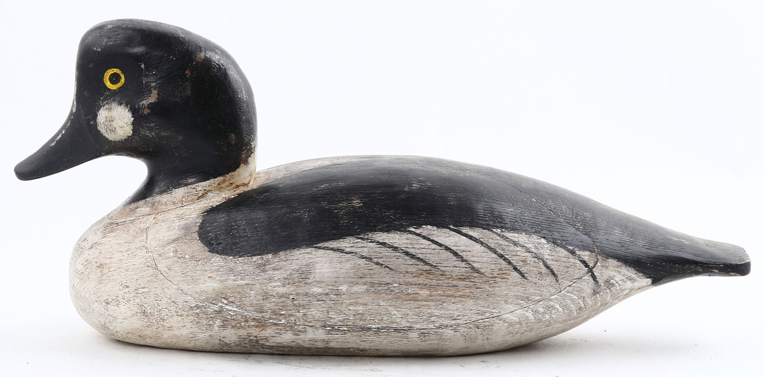 Goldeneye Drake by Bob Booth, Chincoteague Island, VA, PE, hollow wood, original paint, structurally excellent, signed on bottom, 13'' OAL. Grade: Excellent - Value: 40 to 80