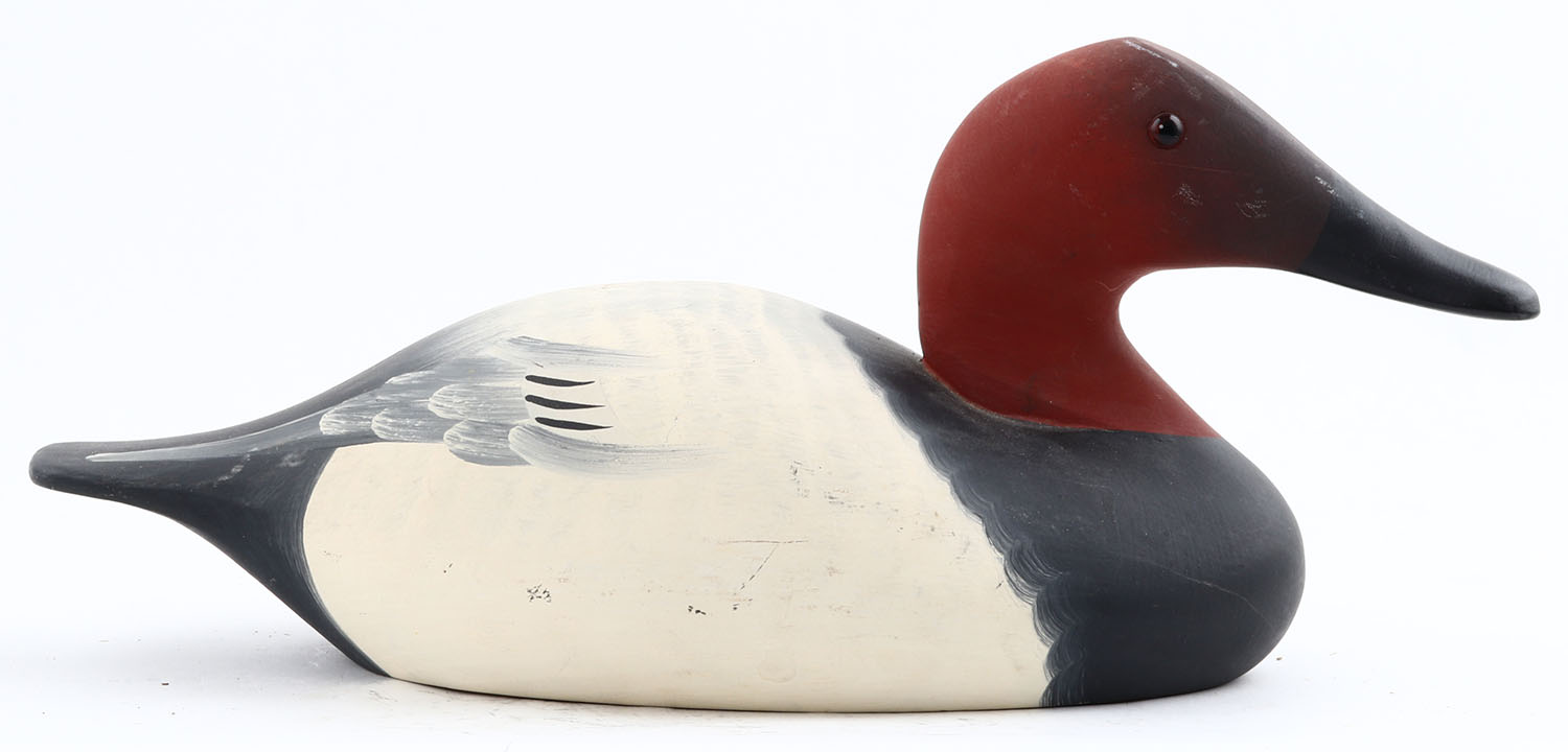 Canvasback Drake by Leonard E. Hornick, Stoney Point, GE, solid wood, original paint, structurally excellent, signed on bottom, 14'' OAL. Grade: Excellent ++ - Value: 30 to 60