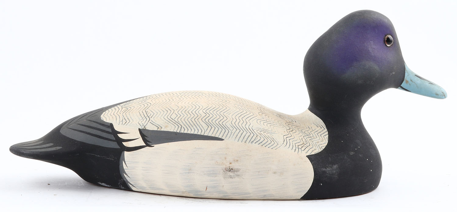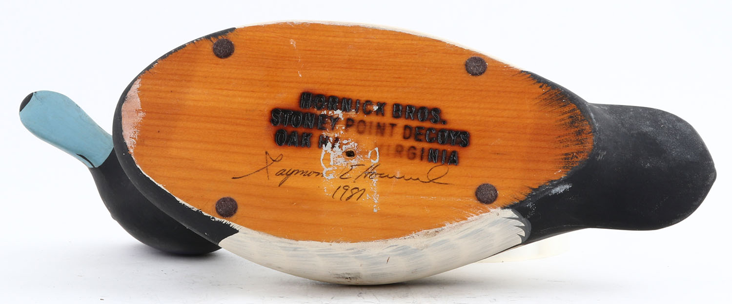 Widgeon Drake by Raymond Hornick, Stoney Point Decoys, Oak Hall, VI, glass eyes, solid wood, original paint, structurally excellent, stamped & signed on bottom. Grade: Excellent + - Value: 20 to 40