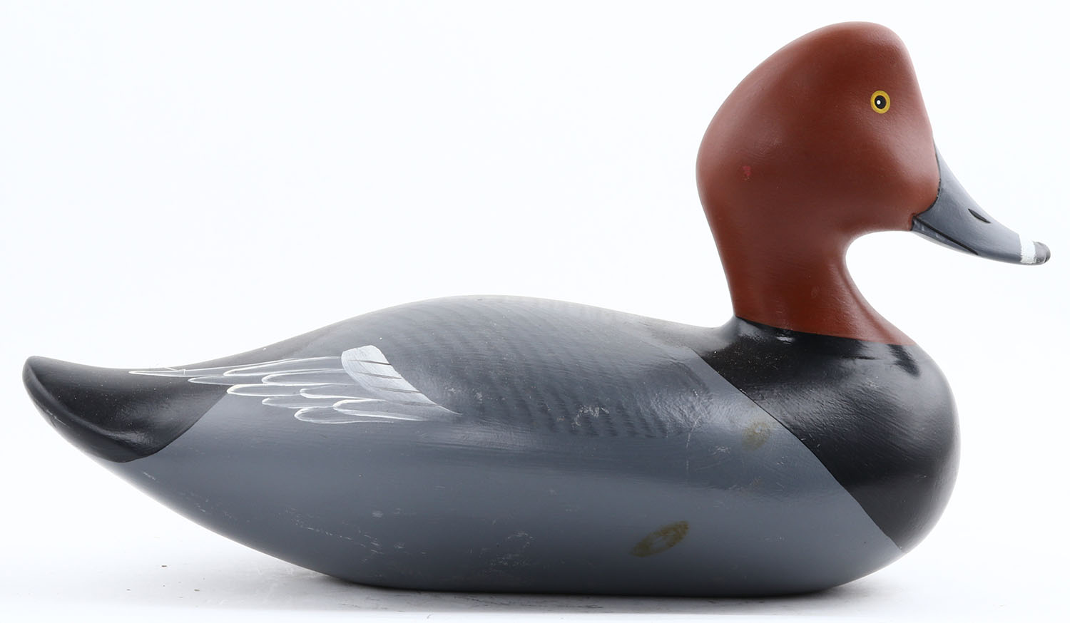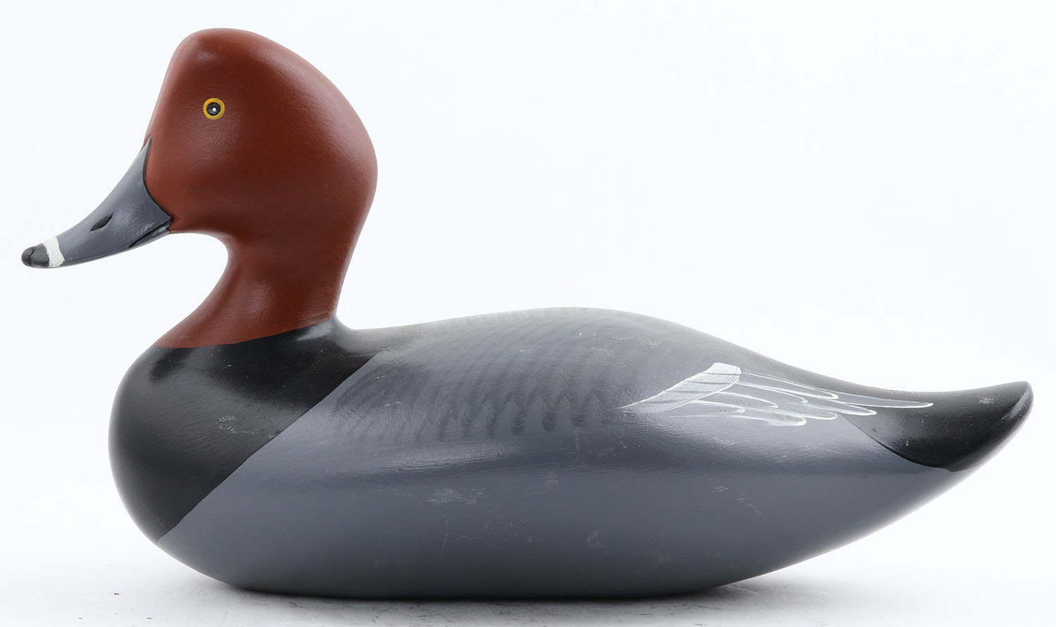 Redhead Drake by Charles Jobes, Havre De Grace, MD, painted eyes, solid wood, original paint, signed on bottom, structurally excellent, 13'' OAL. Grade: Excellent ++ - Value: 30 to 80