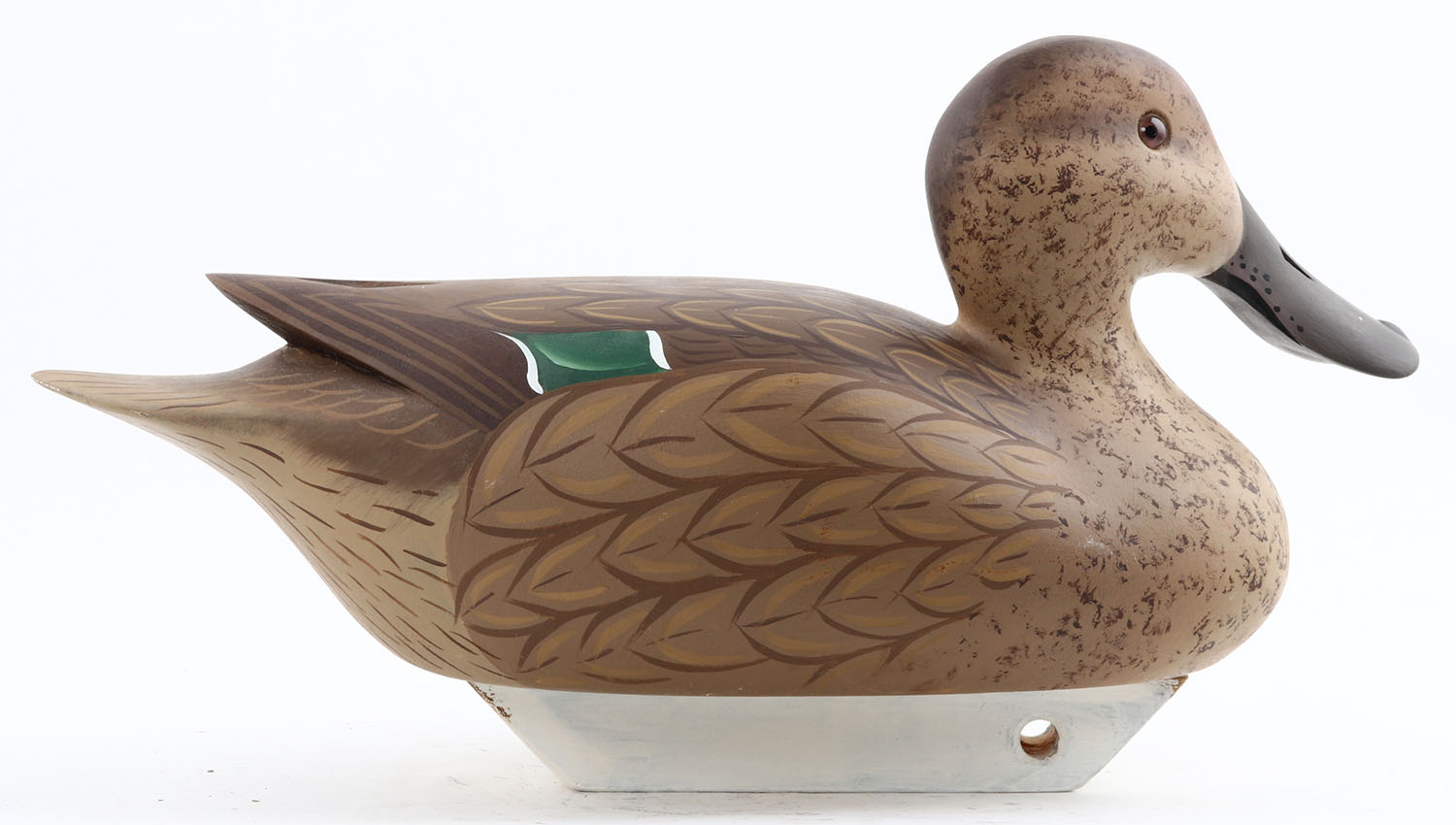 Shoveler Hen by Bill Schauber, Chestertown, MD, glass eyes, hollow wood, original paint, structurally excellent, signed on bottom. Grade: Excellent + - Value: 80 to 250