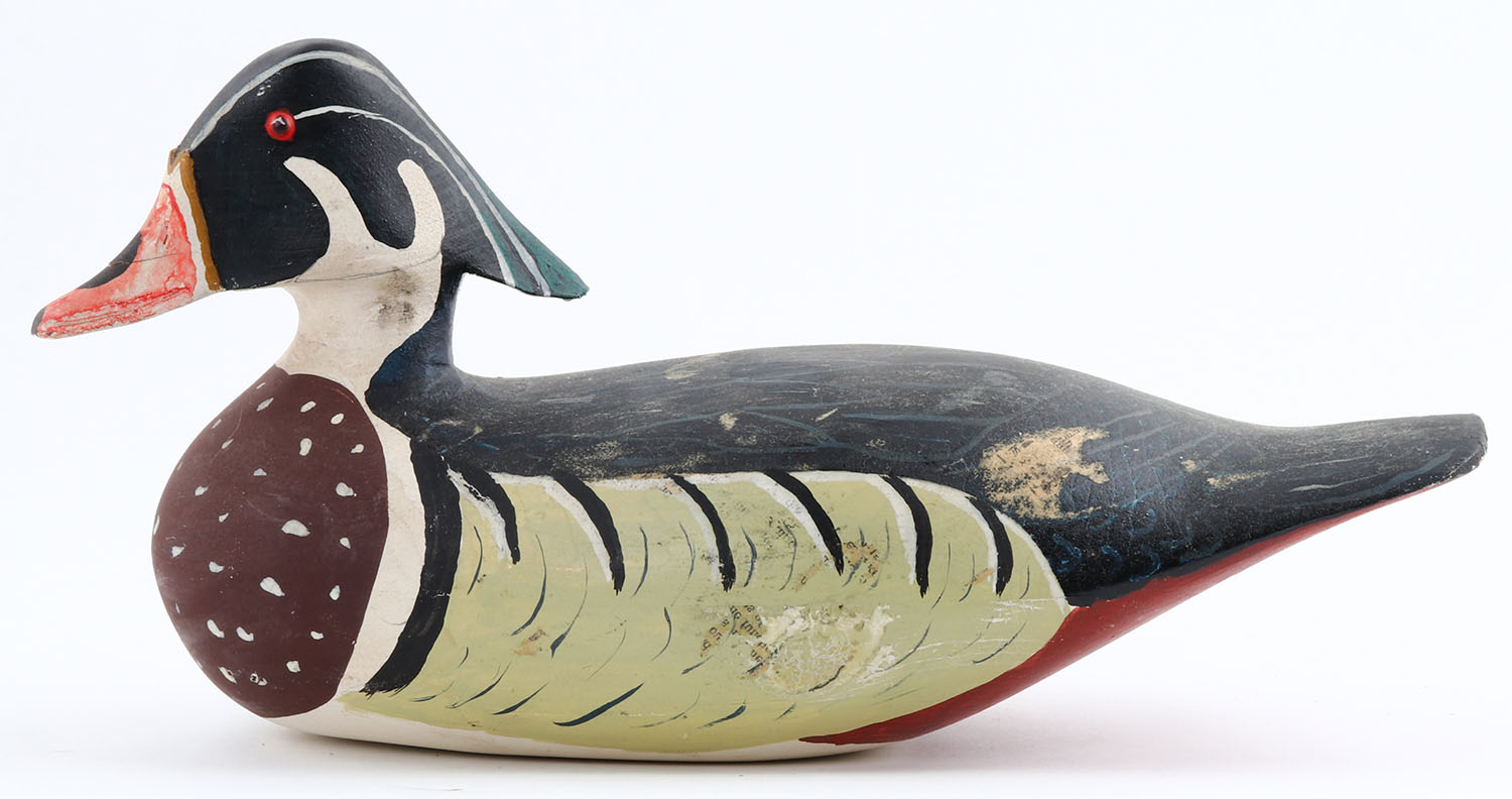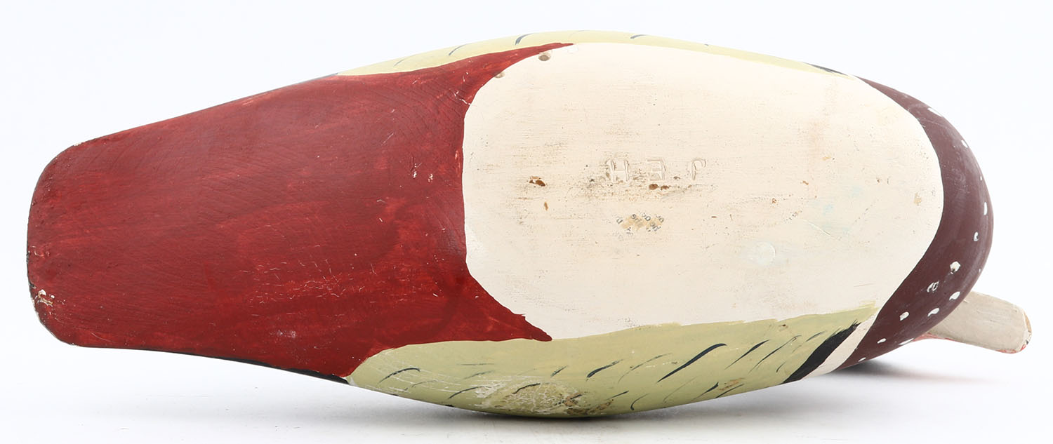 Woodduck Drake by JEH and so branded on bottom, TE, hollow wood, original paint, bill has been broken & shows only a hair line crack, 13'' OAL. Grade: Very Good + - Value: 20 to 60