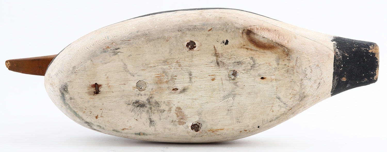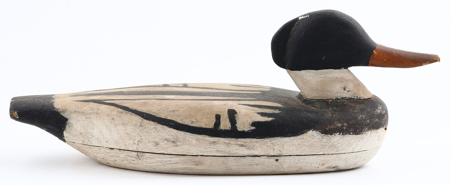Hooded Merganser Drake by unknown maker, No Eyes, hollow wood, original paint, structurally excellent, 15'' OAL. Grade: Excellent - Value: 40 to 80