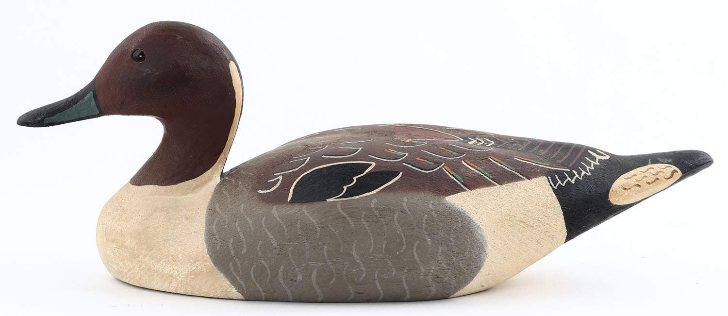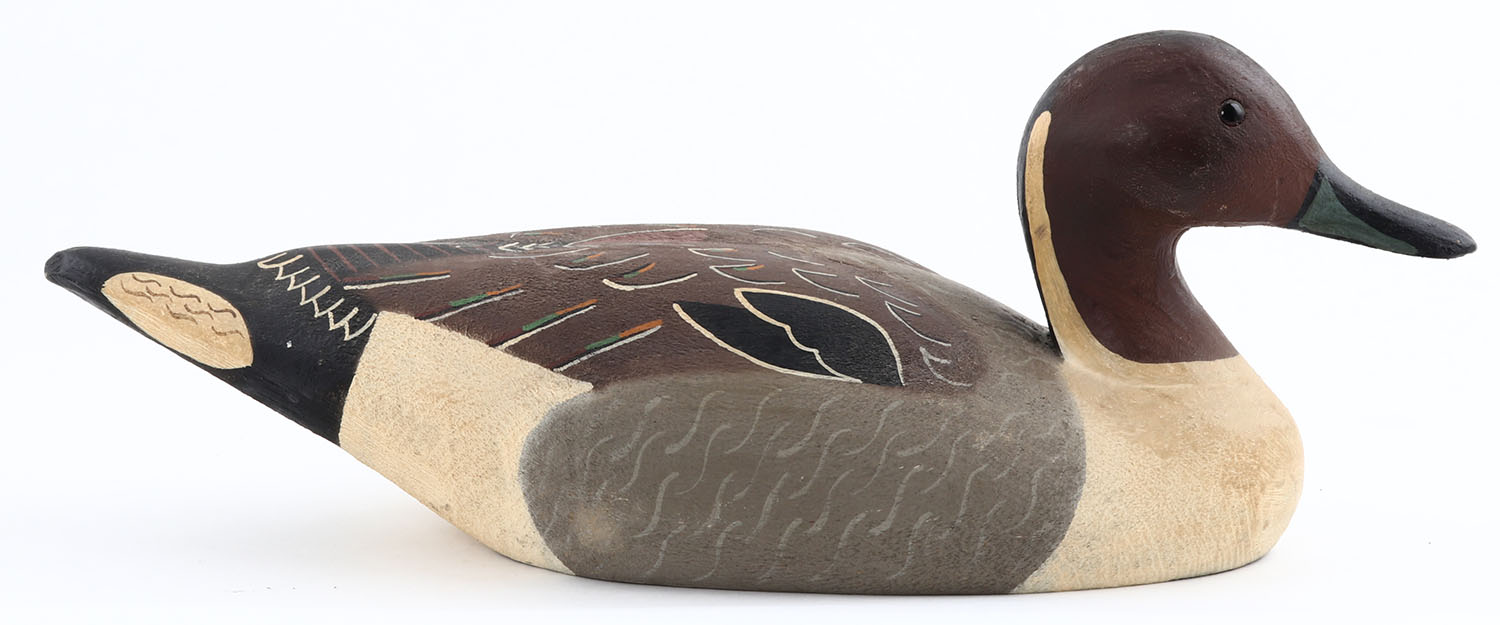Pintail Drake by Herters Decoy Co., Waseca, MN, 1893 series, glass eyes, solid wood, original paint, structurally excellent, marked on bottom. Grade: Excellent ++ - Value: 50 to 300