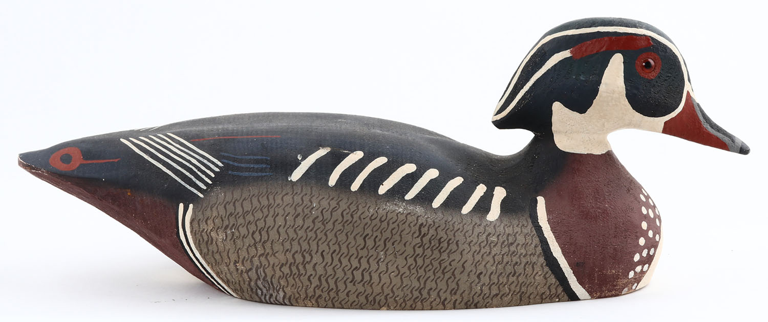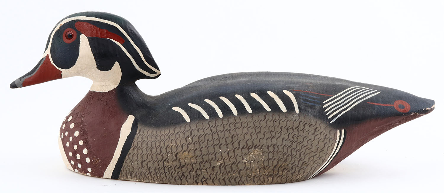Woodduck Drake by Herters Decoy Co., Waseca, MN, 1893 series, glass eyes, solid wood, original paint, structurally excellent, marked on bottom. Grade: Excellent ++ - Value: 50 to 300