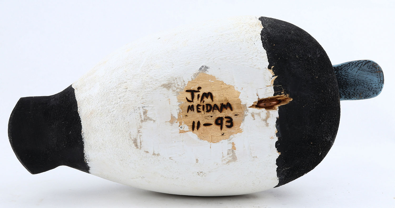 Bluebill Drake by Jim Meidam, glass eyes, solid wood, original paint, structurally excellent. Grade: Excellent - Value: 20 to 80
