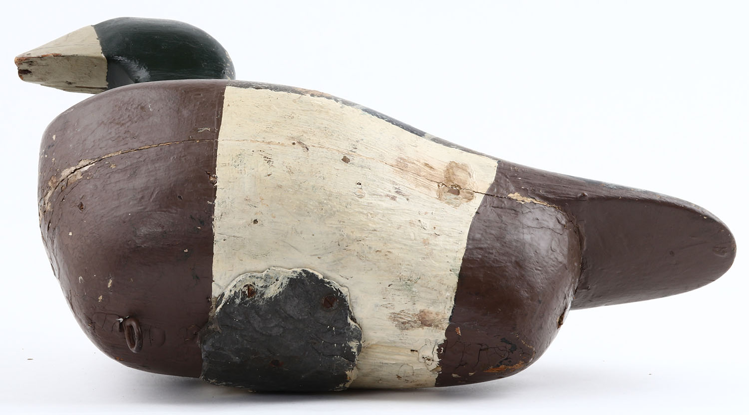 Mallard Drake by unknown maker, no eyes, hollow wood, original paint, structurally excellent. Grade: Excellent - Value: 10 to 60