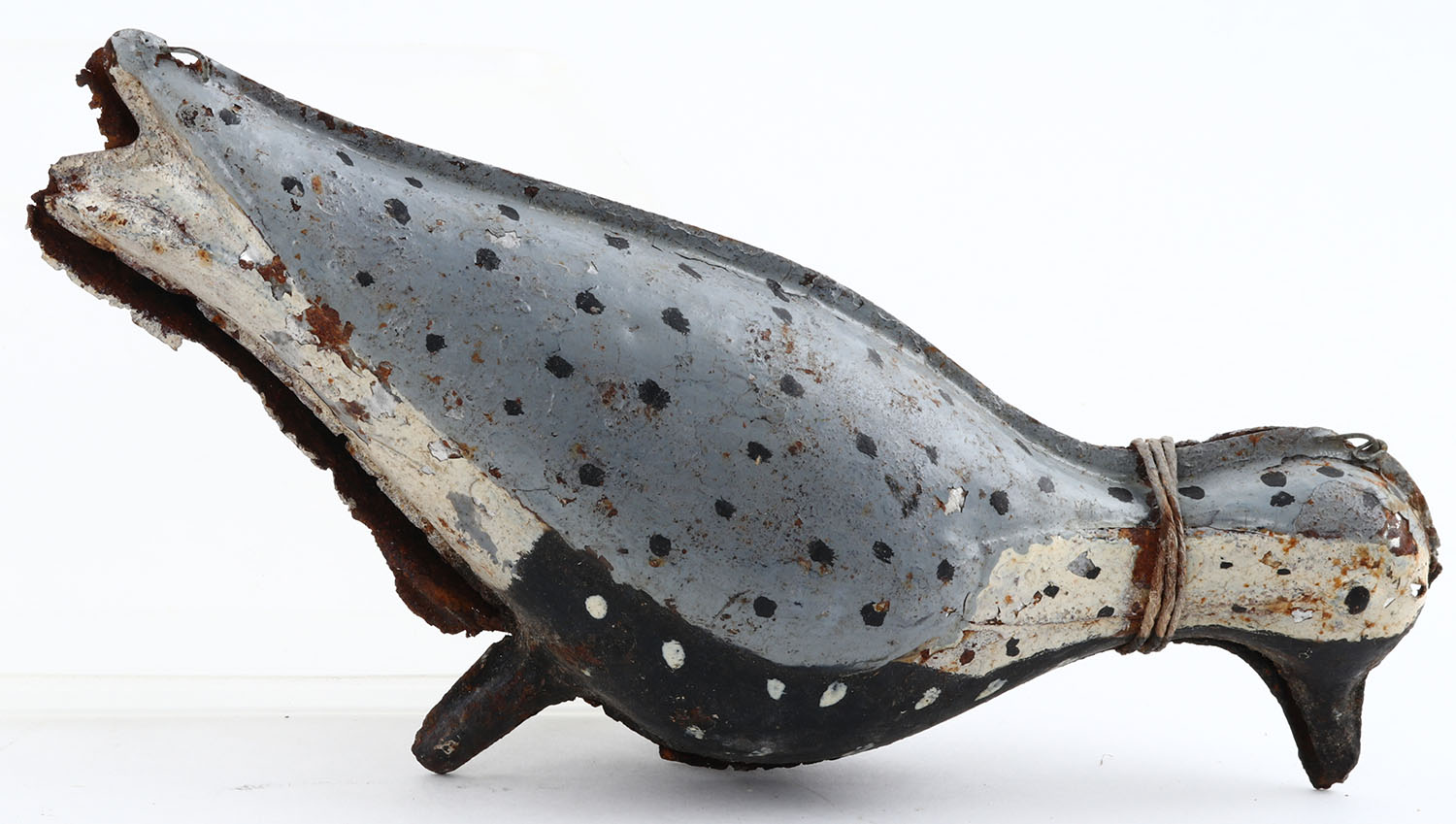 Metal 2pc. Tinny, Shorebird by Strater & Sohier, Boston MA, painted eyes, with wire hinges, dowel with no base, original paint, 10'' OAL. Grade: Excellent - Value: 50 to 200