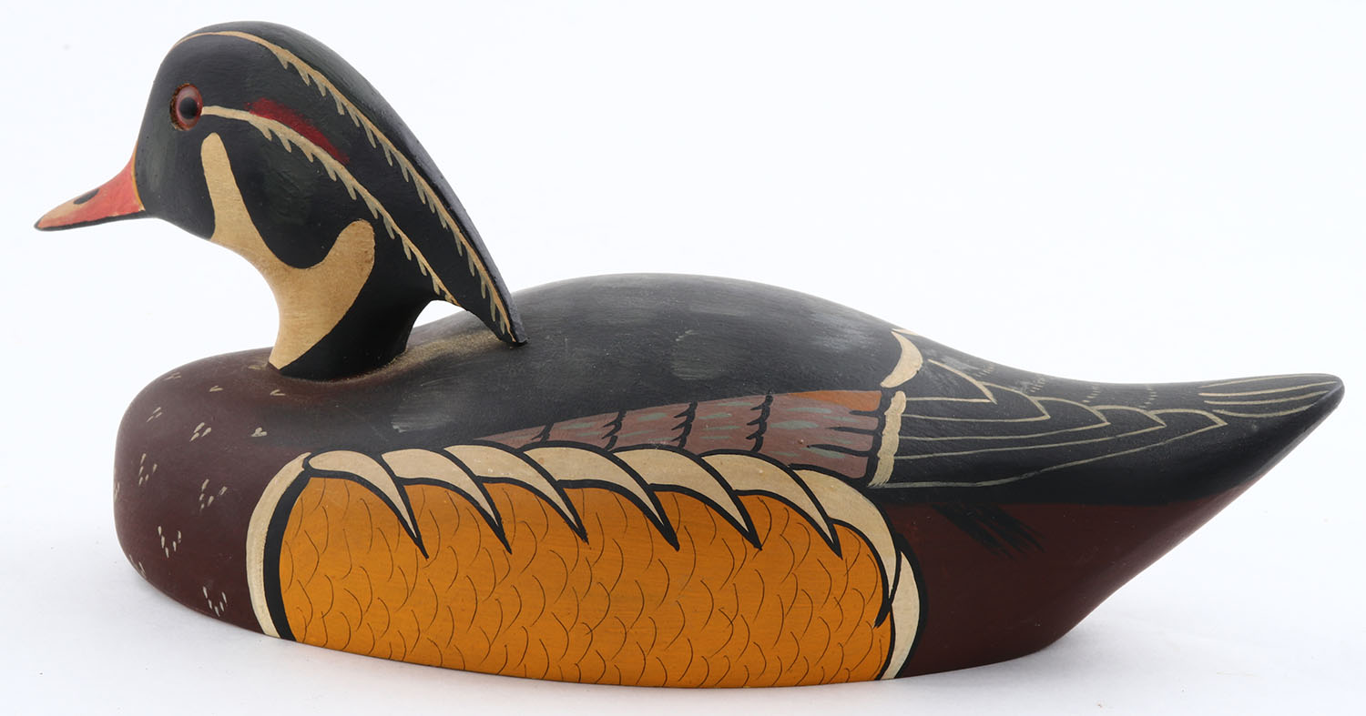 Miniature Woodduck Drake by Charles R Bridsall and so marked on bottom, GE, solid wood, mint paint, circa 1972, 10'' OAL. Grade: MINT - Value: 50 to 400