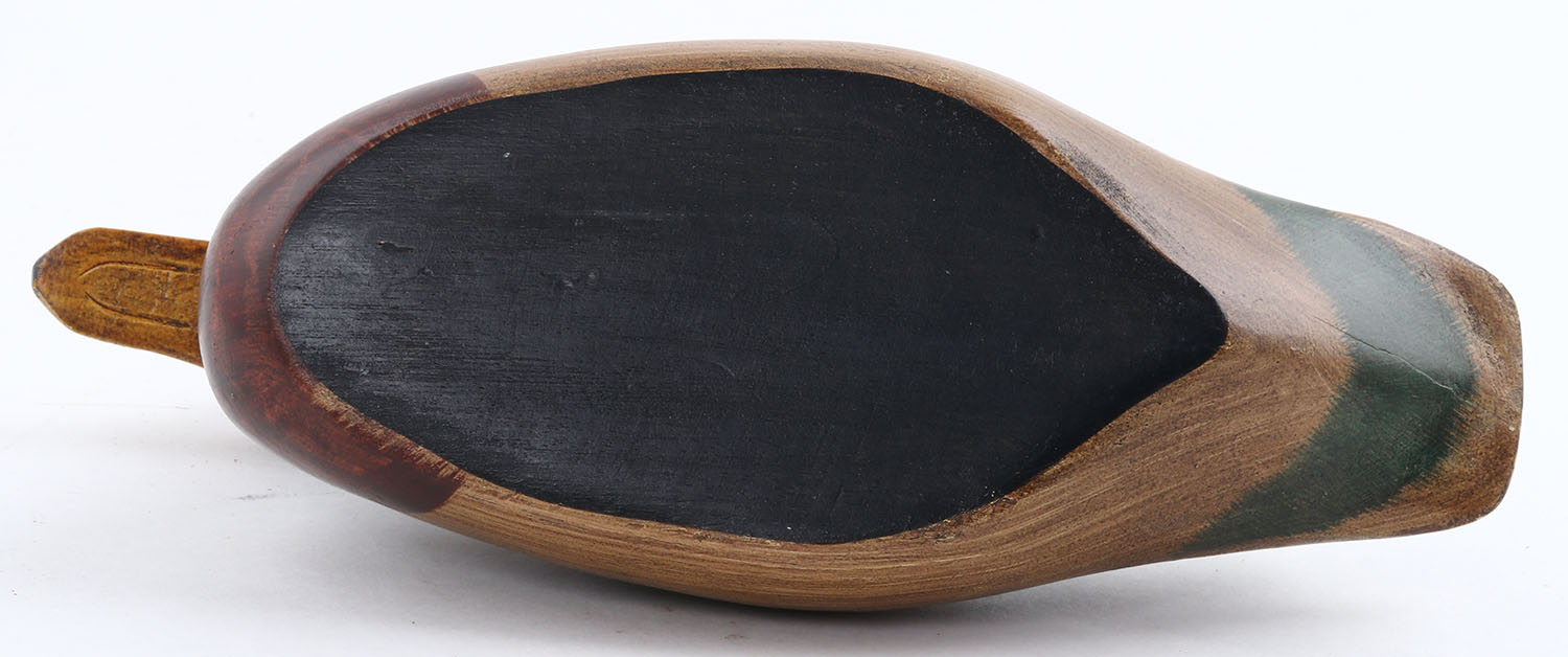 Miniature Mallard Drake by Unknown maker, GE, solid wood, mint paint, 9'' OAL. Grade: MINT - Value: 10 to 30