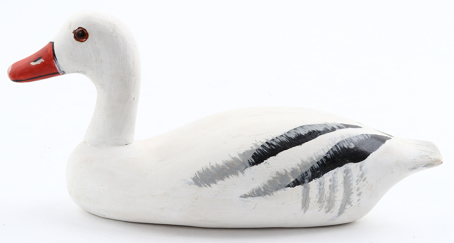 Miniature Snow Goose by Ted Rick and so marked on bottom, GE, solid wood, mint paint, circa 1985, 8'' OAL. Grade: MINT - Value: 20 to 60