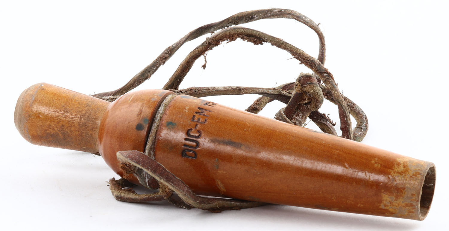 Oliveros Mfg. Co, DUC-EM, Tone Tested Duck Call, Houston, TX, copper reed, 5'' OAL, shows wear & handling marks from use, finish is good, but faded in some areas, aged leather lanyard. Grade: Good++ - Value: 10 to 60