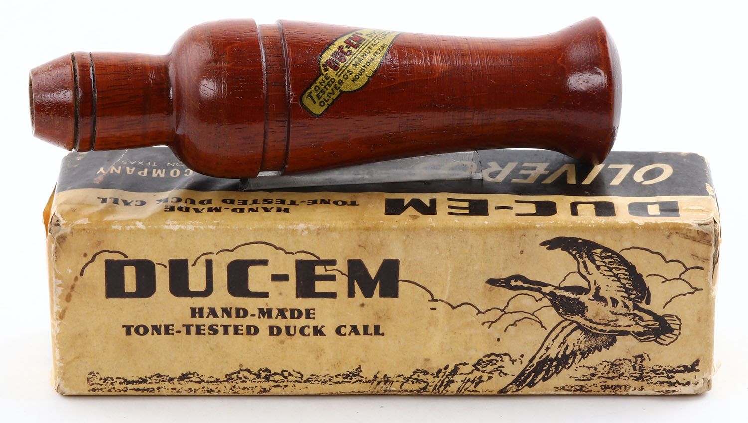 BOXED, Oliveros Mfg. Co, DUC-EM, Tone Tested Duck Call, Houston, TX, 1940's-50's, plastic reed, 5'' OAL, shows light wear & handling marks from use, finish is good, but wearing thin in some areas, comes in factory box. Grade: Excellent - Value: 30 to 70
