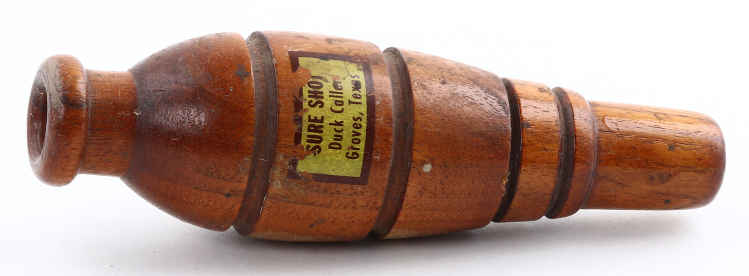 Sure Shot Duck Caller, Groves, TX, marked with sticker on barrel, single piece, grooved barrel, 5'' OAL, finish is good, but has light wear, thinning & dark spots throughout. Grade: Very Good - Value: 10 to 50