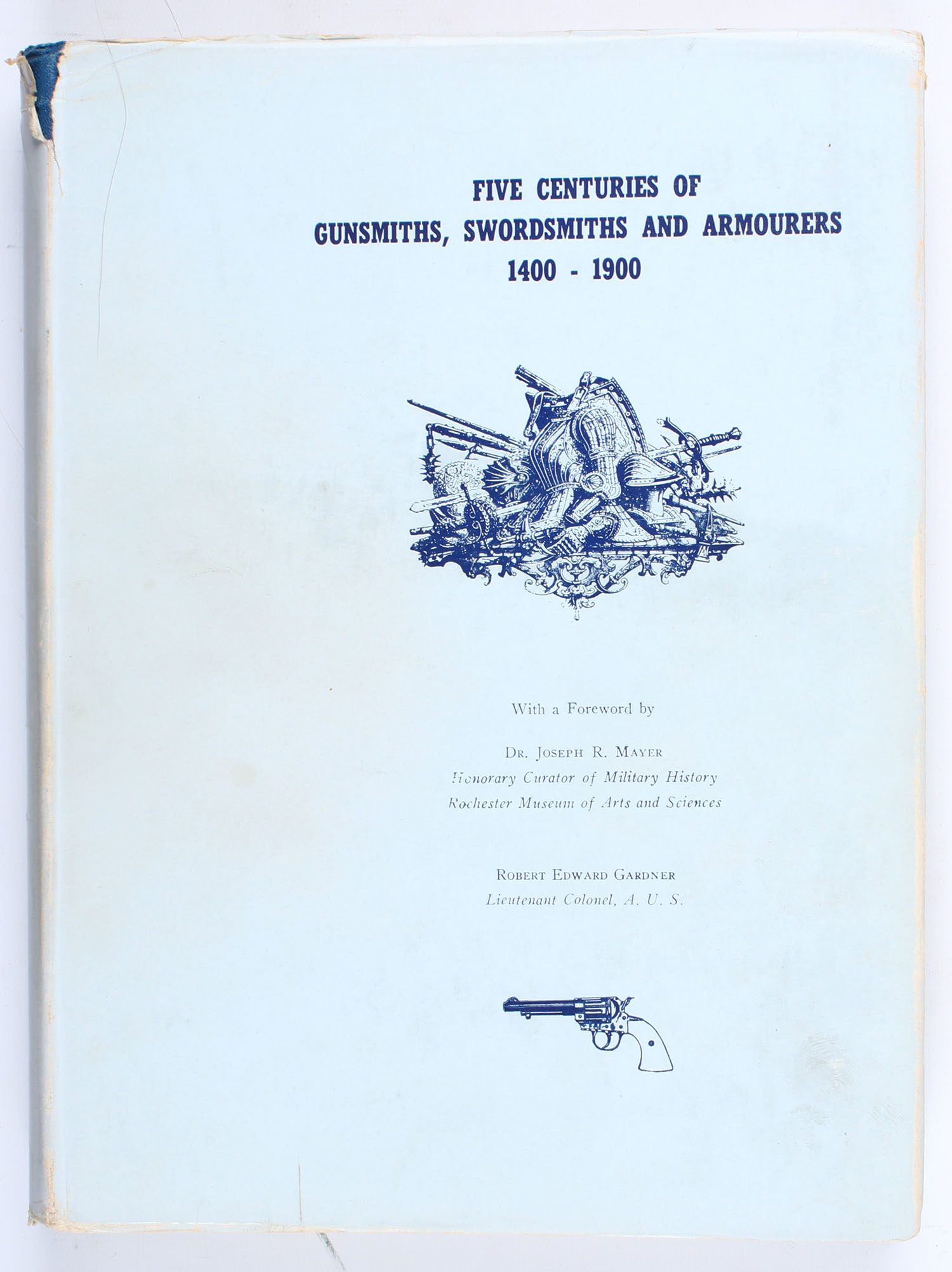 Five Centuries of Gunsmiths, Swordsmiths and Armourers 1400-1900 by Robert Edward Gardner 1948, 8'' x 10 1/2''. 244 pages, pages clean, binding tight, hardcover very good, dustjacket has tears. Value: $50 Grade: Very Good + - Value: 2 to 50