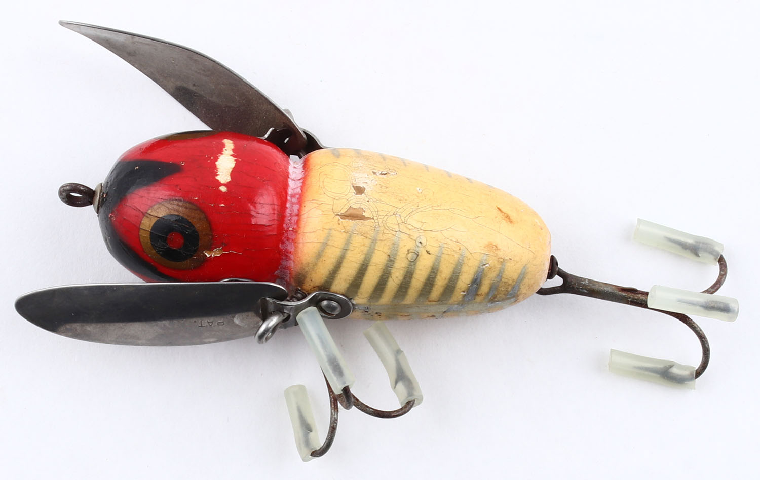Heddon Crazy Crawler, wood lure, red & cream, spook pattern, 2 hook lure, 2 folding blades, marked, light wear & cracking to paint. Grade: Very Good ++ - Value: 20 to 60