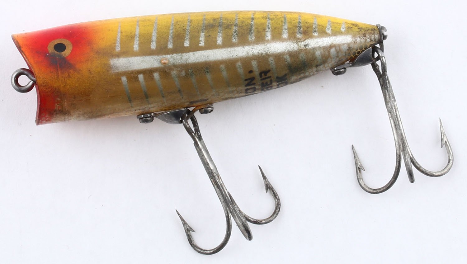 Heddon Chugger Spook, plastic lure, PE, yellow & red, with silver scales & stripes, surface rig, 2 hooks, marked on belly, 3'' OAL. Grade: Very Good - Value: 10 to 50