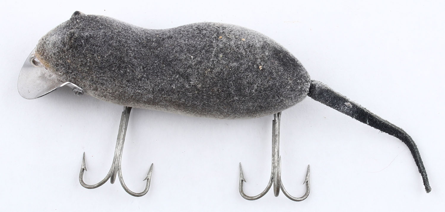 Heddon Meadow Mouse, wood lure, no eyes, gray with leather tail, surface rig, 2 hooks, 3'' OAL. Grade: Good++ - Value: 10 to 50