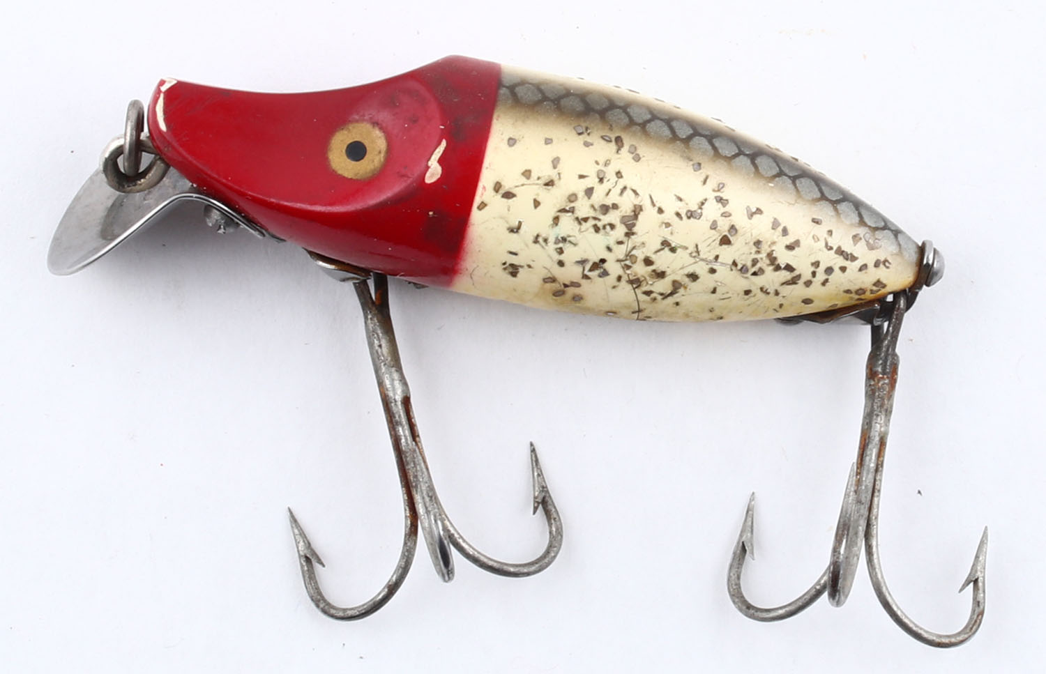 Heddon River Runt Spook Sinker, plastic lure, PE, red head with white speckled body, yellow belly & silver scales on back, surface rig, 2 hooks, fixed front blade, 2 1/2'' OAL. Grade: Very Good++ - Value: 10 to 50