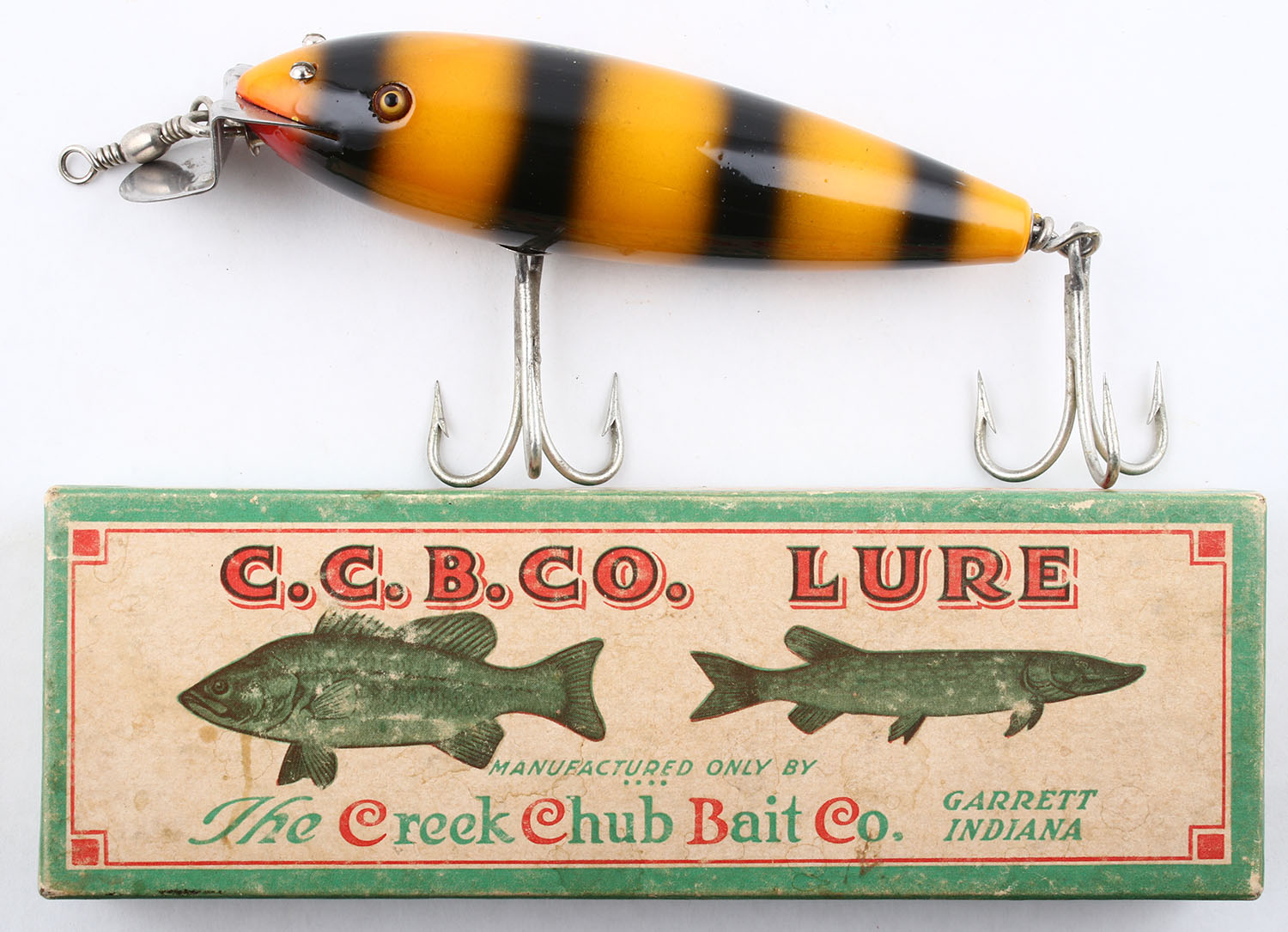 Creek Chub Husky Musky, wood lure, GE, bumble bee pattern, 2 hooks, 5'' OAL. Comes in CCB box, but doesn't appear original to the lure. Grade: Excellent + - Value: 20 to 60
