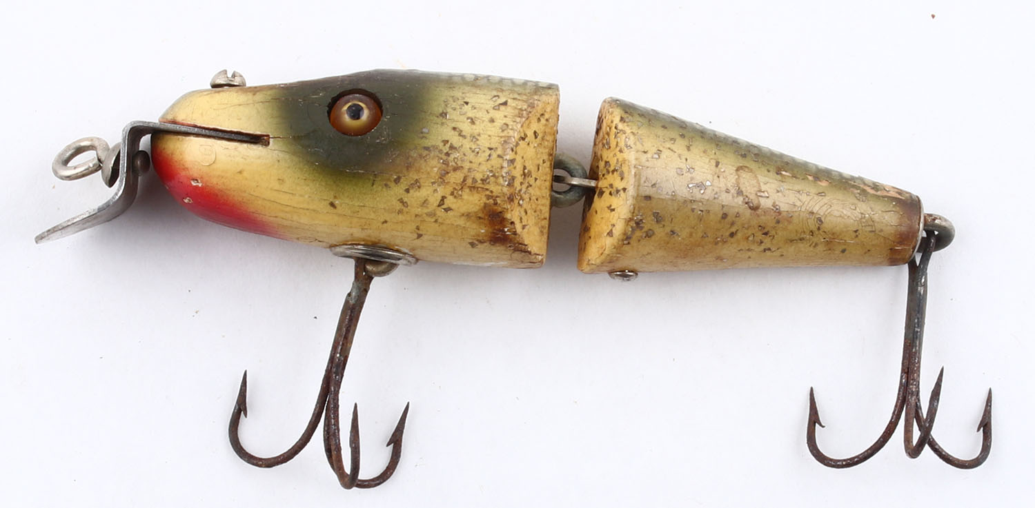 Creek Chub, jointed wood lure, GE, green, yellow & red with silver scales & sparkles, marked on front blade, 2 hooks, 3 1/2'' OAL. Grade: Very Good - Value: 10 to 50
