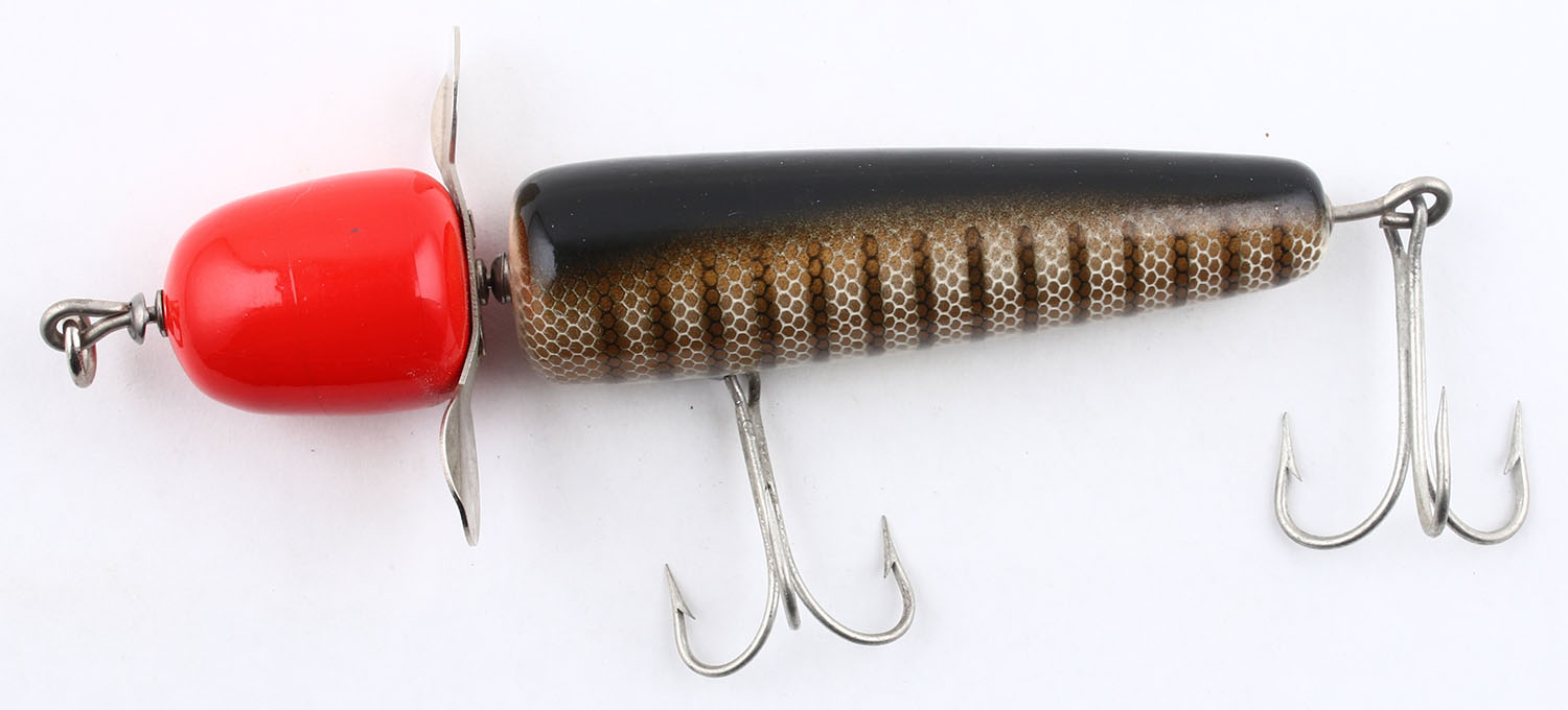 Vintage Pflueger Musky Globe Pike Scale Red Head, wood lure, NE, black & white with stripes & gold scales, surface rig, marked on blade, 2 hooks, 5 1/2'' OAL. Grade: Excellent++ - Value: 10 to 50