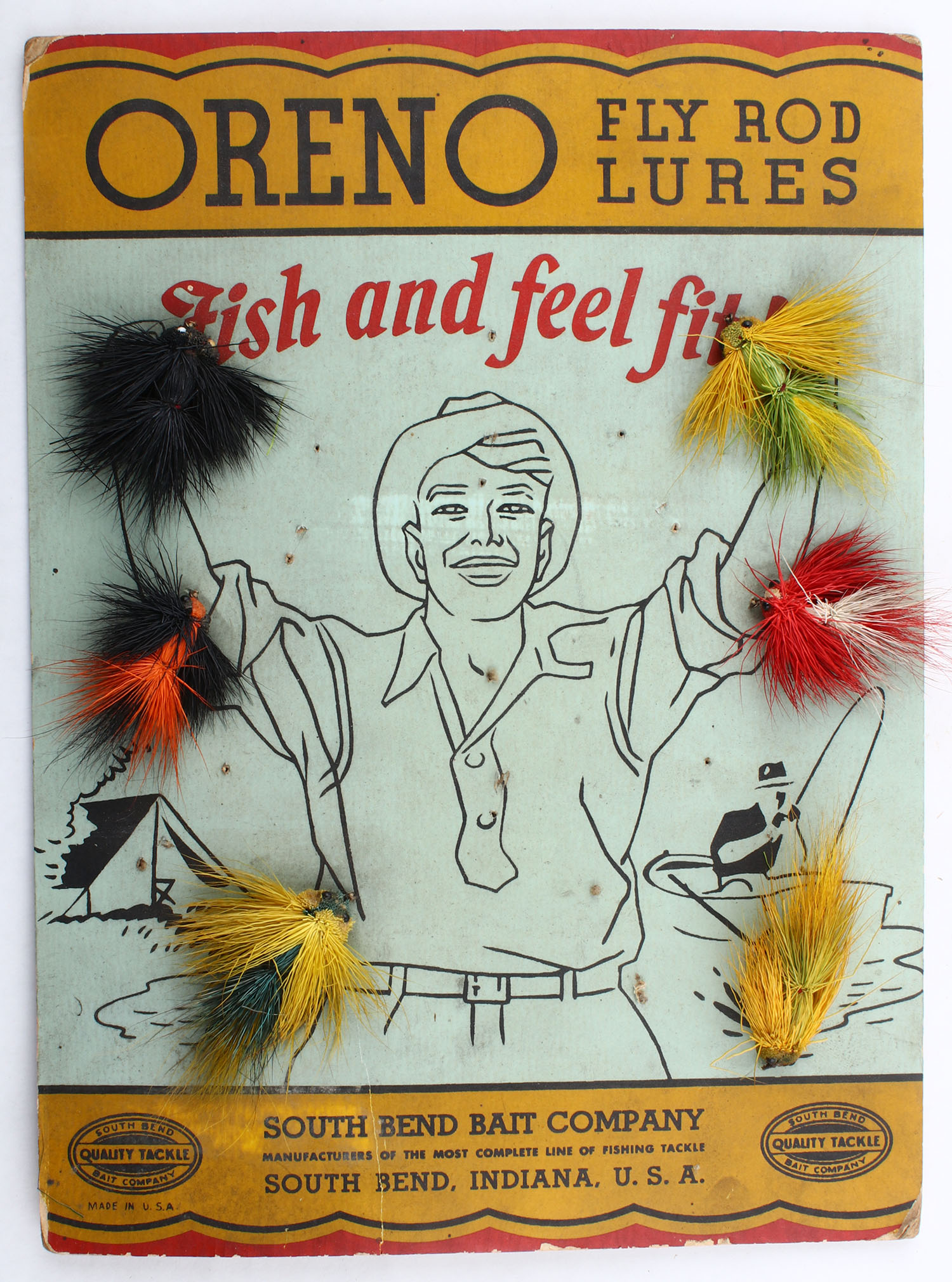 South Bend Oreno Fly Rod Lures on display stand, 6 single hook lures, assortment of colors. Display has rear stand. Grade: Very Good - Value: 20 to 80