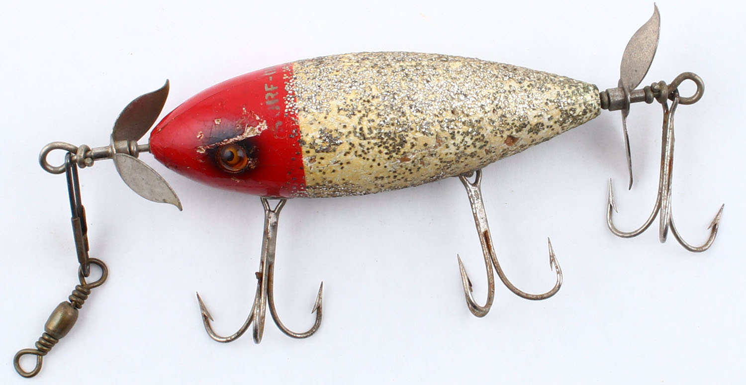 South Bend Surf-Oreno, wood lure, GE, red, white & sparkles, marked on top, 3 hooks, 2 double blades, 3 1/2'' OAL. Grade: Very Good - Value: 10 to 50