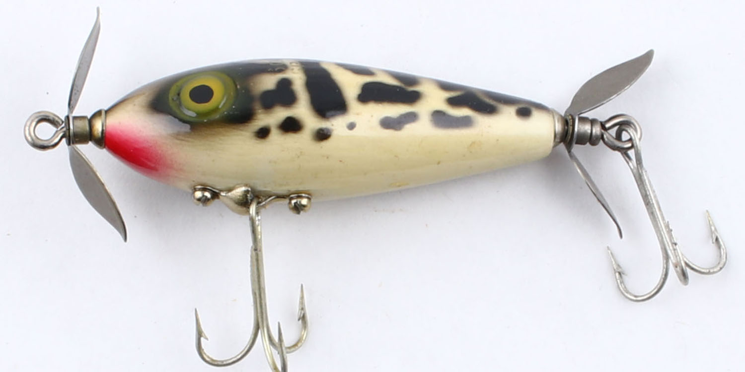 South Bend Spin-I-Diddee, wood lure, PE, cream with black spots & red tip, marked on top, 2 hooks, 2 spinning blades, 2 1/2'' OAL. Grade: Excellent+ - Value: 10 to 50