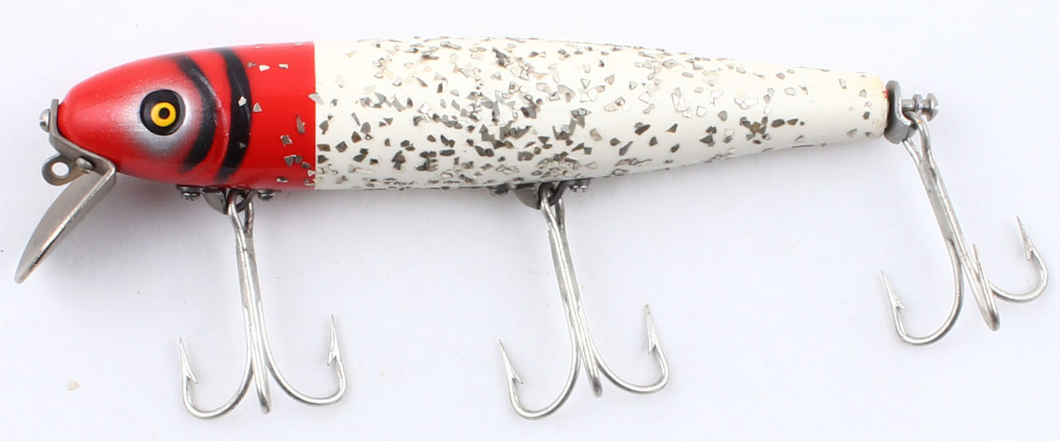 Pfleuger Mustang, wood lure, PE, red, white & black with sparkles, marked on blade, surface rig, 3 hooks, 4 1/2'' OAL. Grade: Excellent - Value: 10 to 50