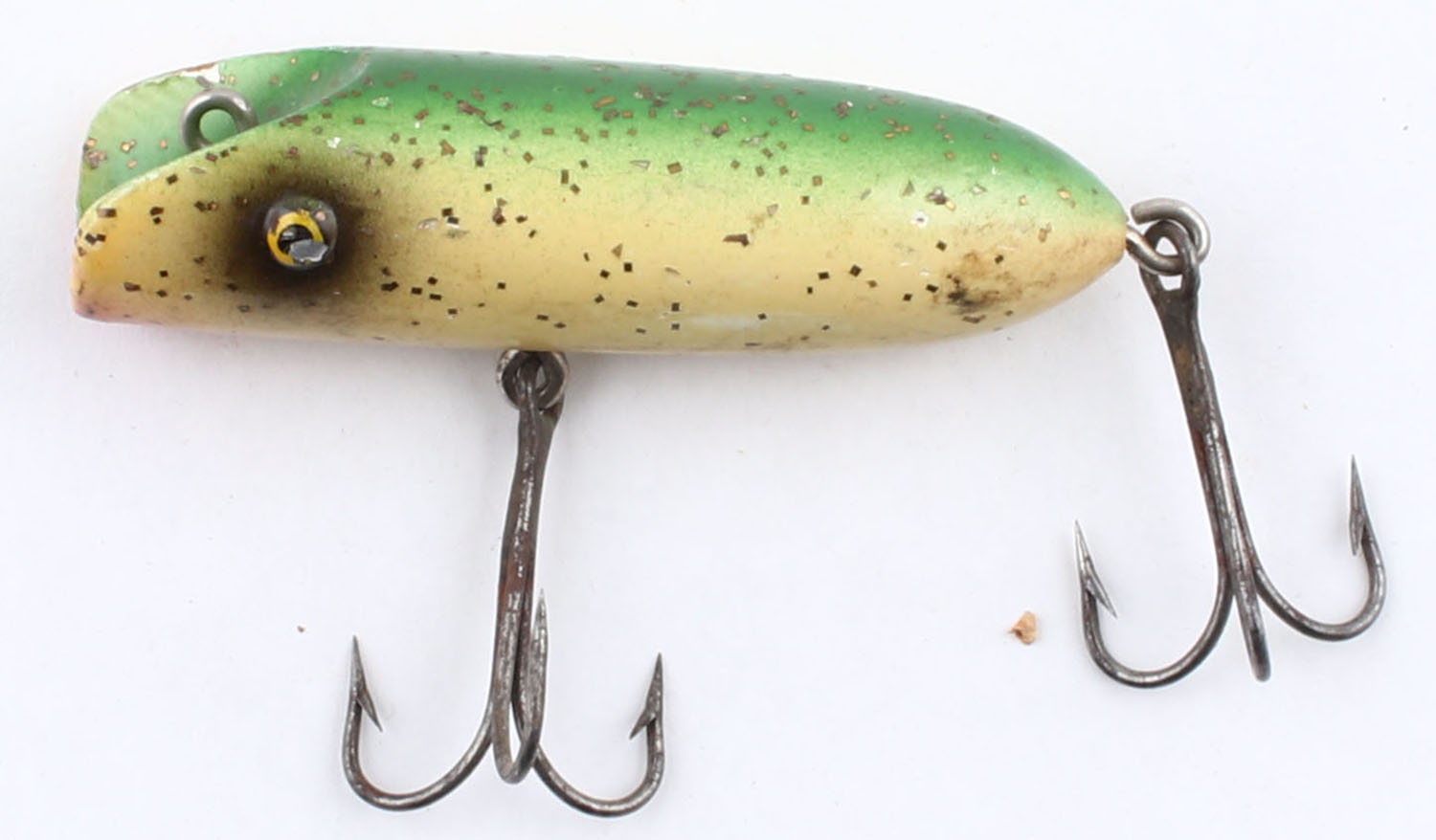 Unmarked, wood lure, TE, green, cream & red with sparkles, 2 hooks, 3'' OAL. Grade: Very Good+ - Value: 10 to 50